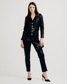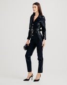 The Zoey Jumpsuit, a fearless embodiment of edgy allure and modern rebellion. This isn't your average jumpsuit; it's a Moto Jumpsuit crafted for those who embrace the thrill of the unexpected. The Zoey Jumpsuit is more than an outfit; it's a statement piece designed for the bold and confident. The moto-inspired details add an unmistakable edge, bringing a touch of rebellious sophistication to your wardrobe. Elevate your style with the Zoey Jumpsuit, where every detail, from the intricate stitching to the sleek silhouette, is meticulously crafted to perfection, leaving an indelible mark on your fiercely unique and edgy persona. Welcome to the epitome of Torn by Ronny Kobo's distinctive allure.