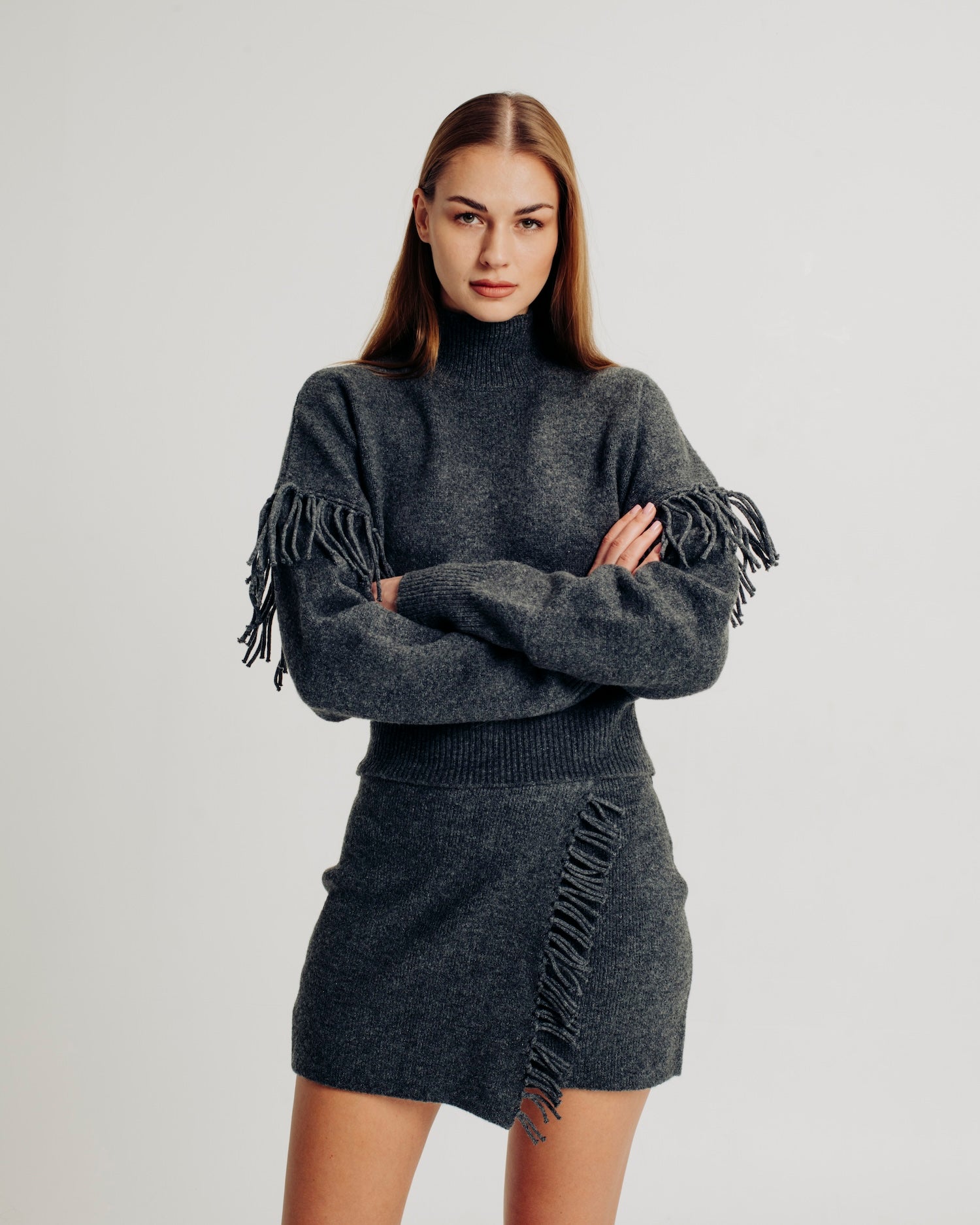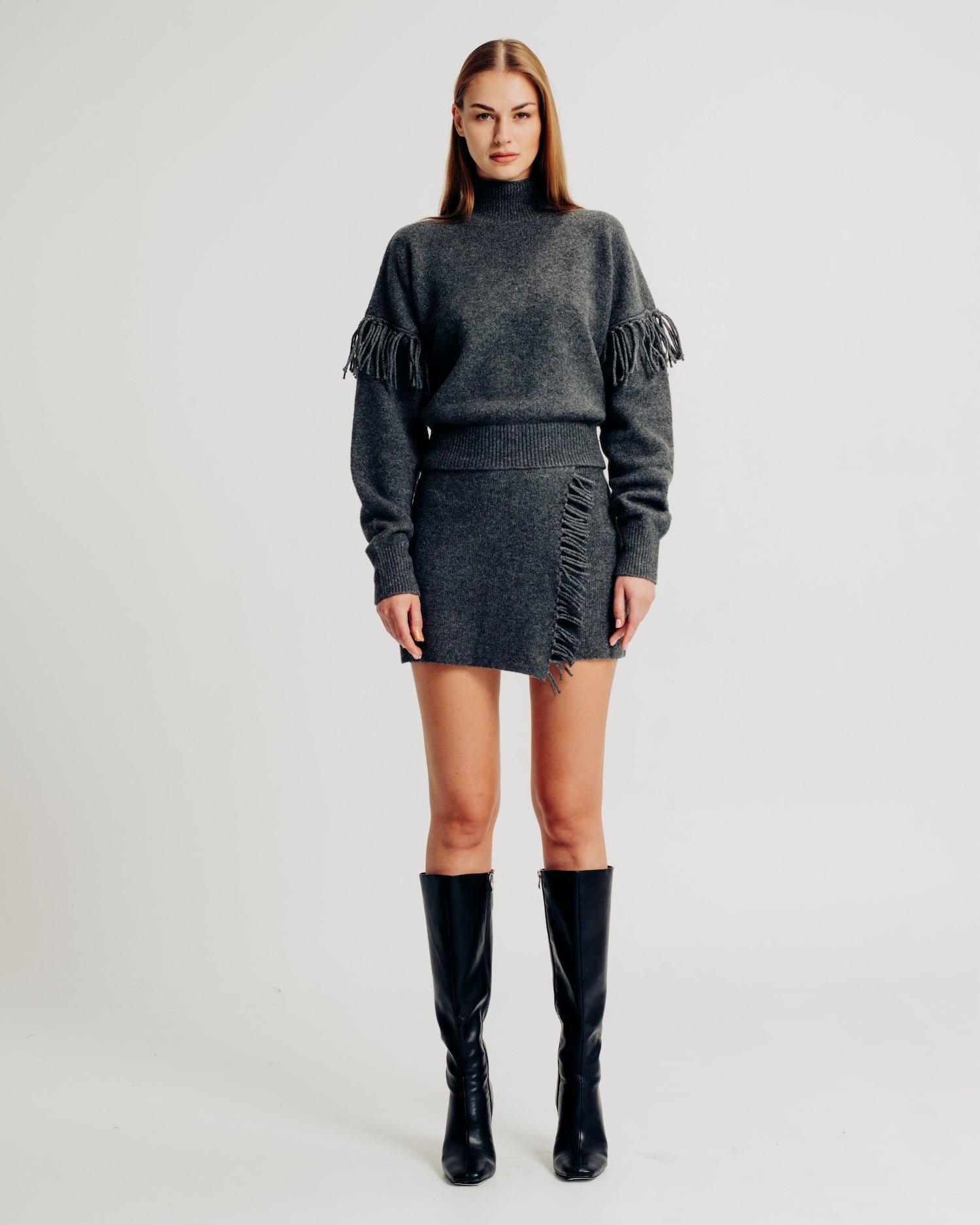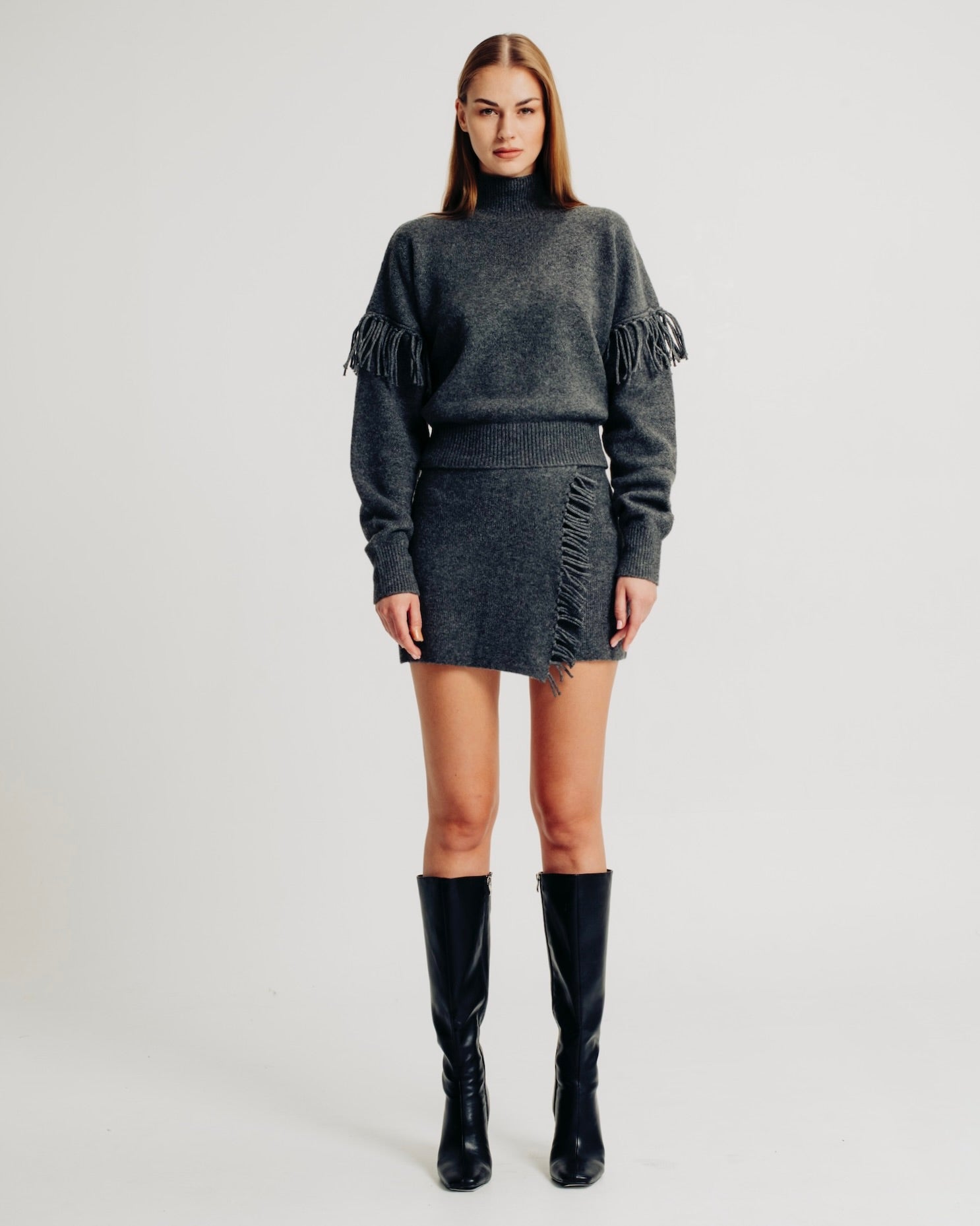 The Joan skirt is crafted from fully fashioned knit for a refined fit. It features a wrap-front design with elegant fringe detailing and an elastic pullover waistband for ease of wear and comfort. Pair with the Joan Top for an allover cozy look.
