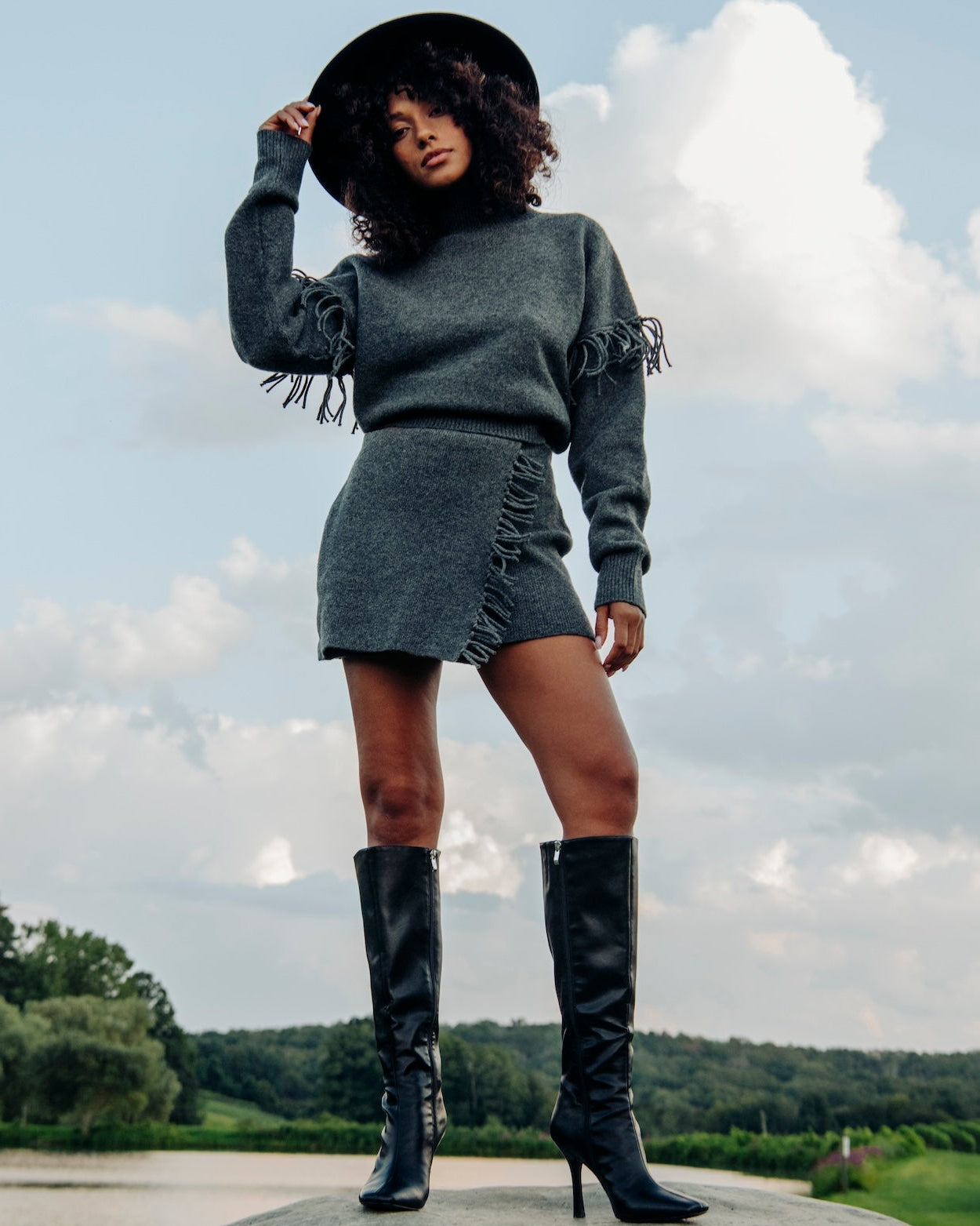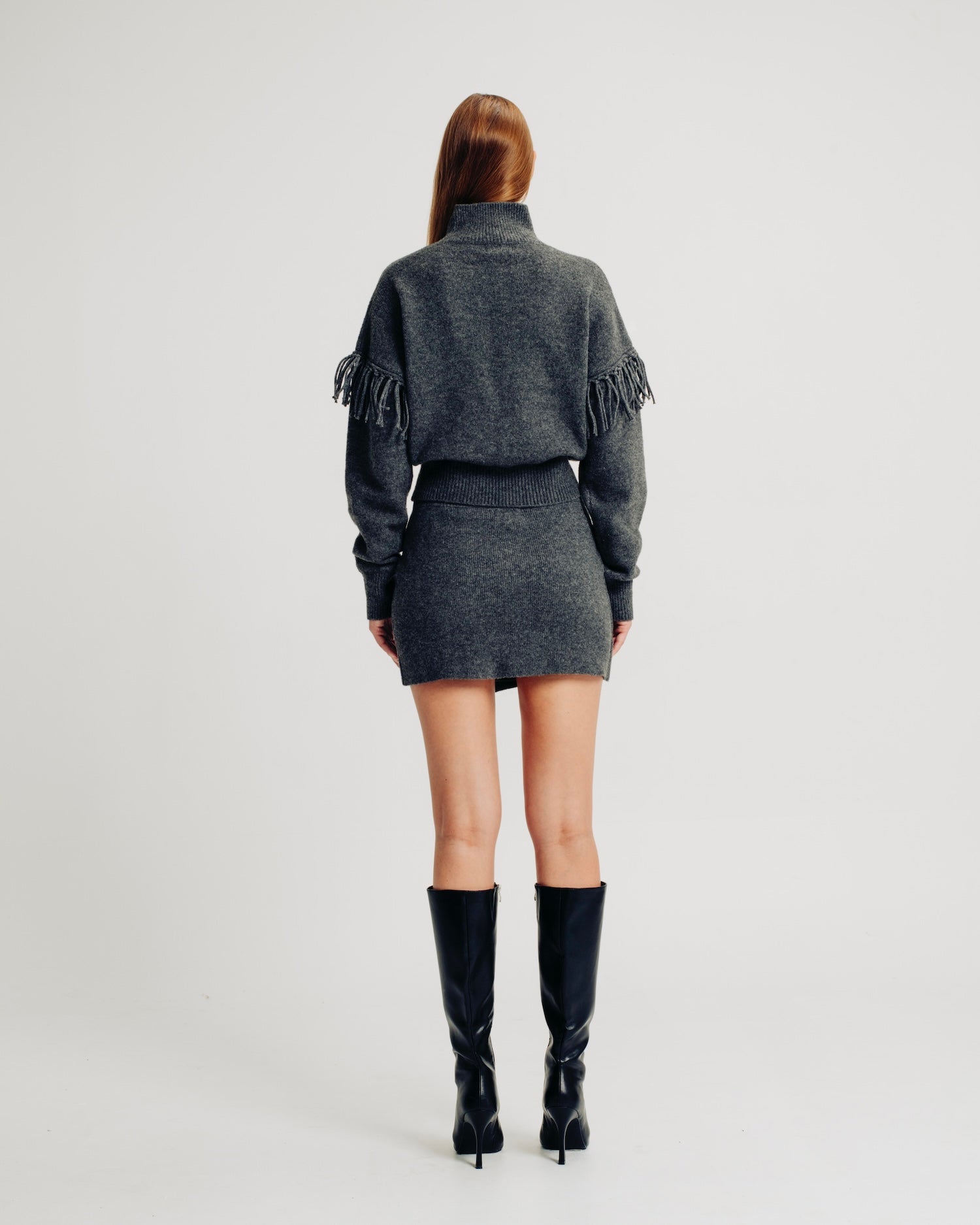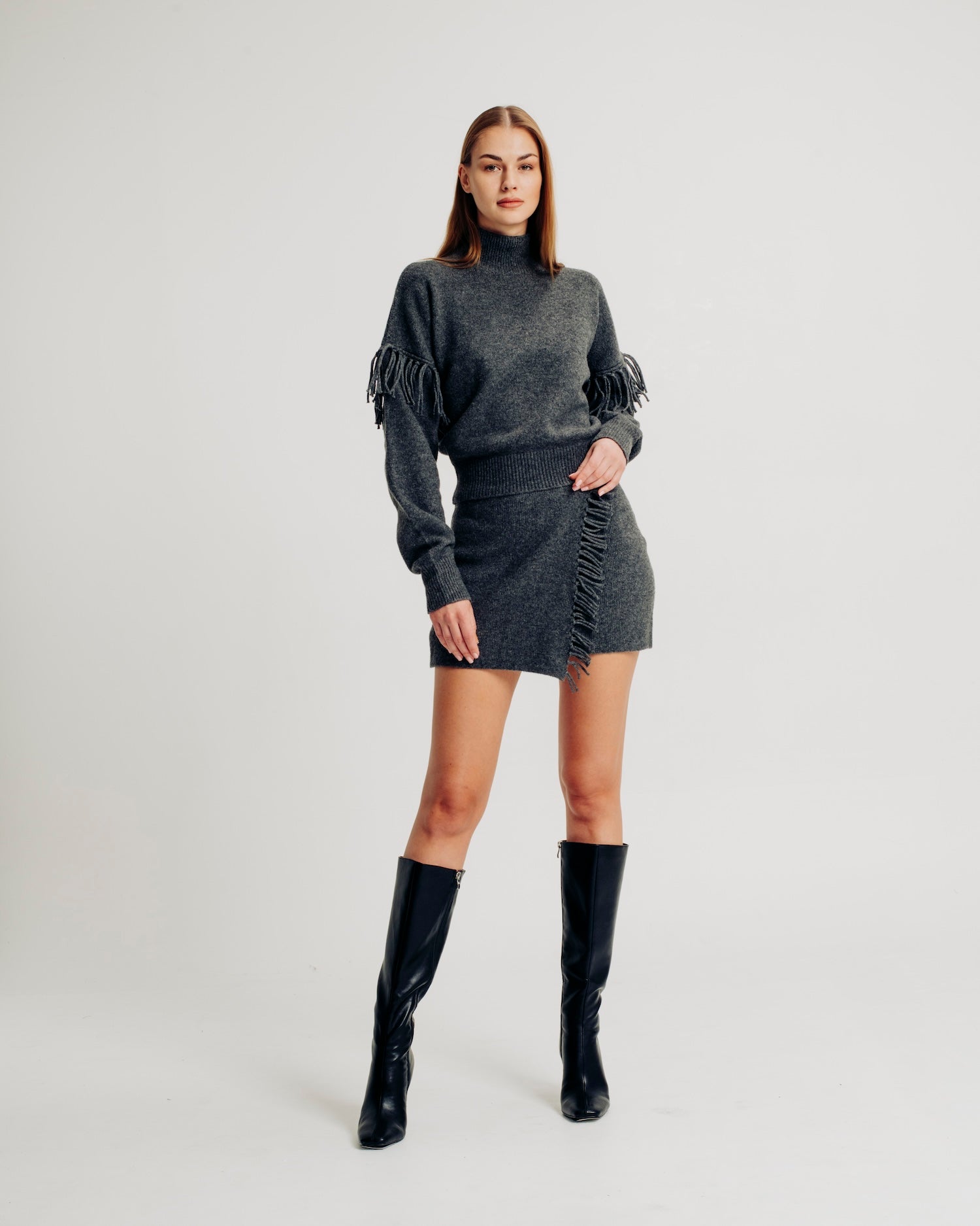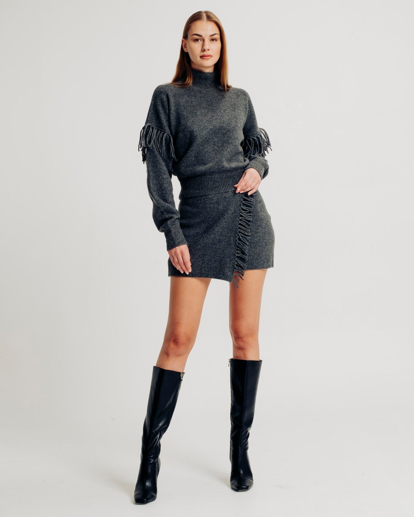 The Joan skirt is crafted from fully fashioned knit for a refined fit. It features a wrap-front design with elegant fringe detailing and an elastic pullover waistband for ease of wear and comfort. Pair with the Joan Top for an allover cozy look.