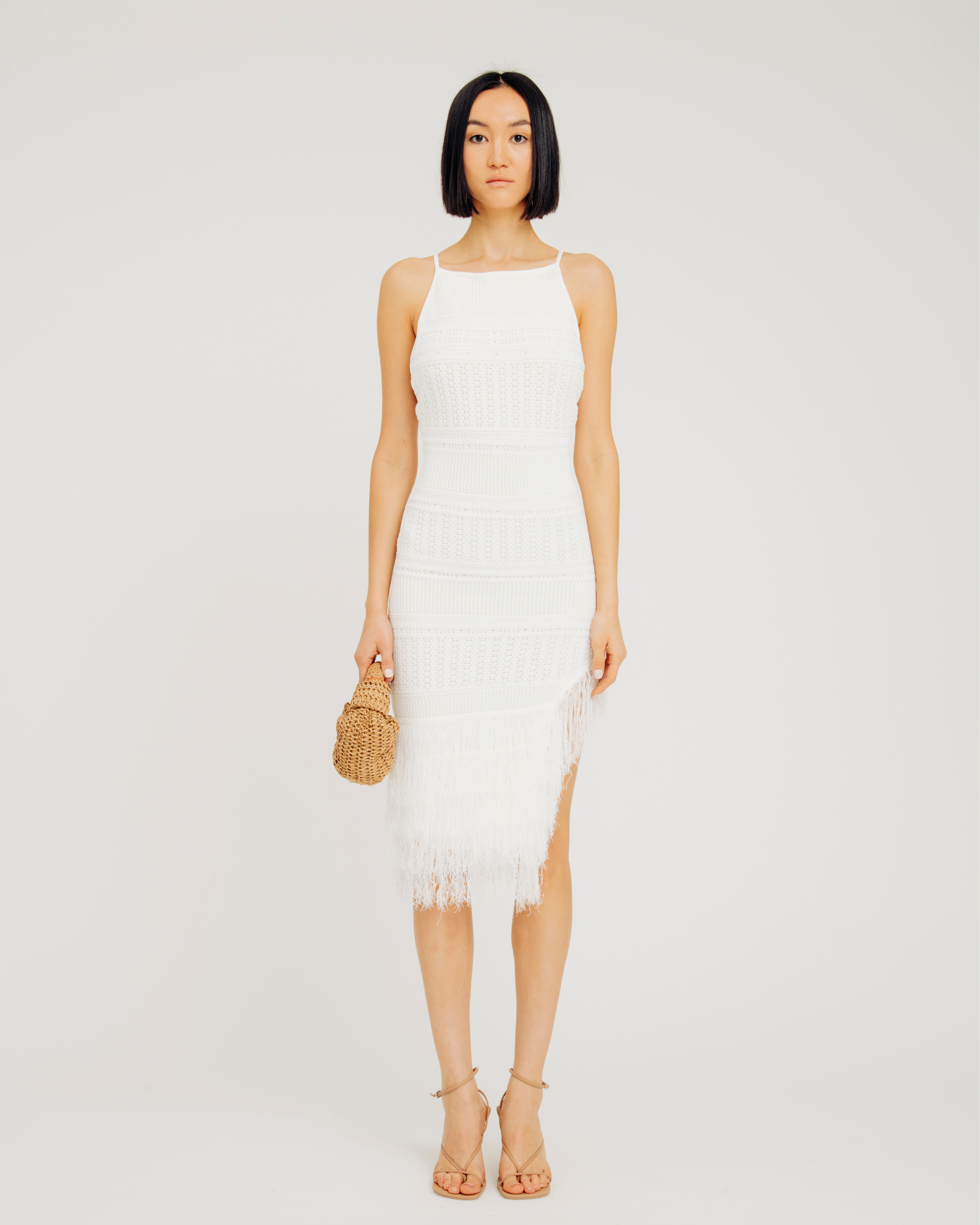 The Yuna Dress is fully fashioned pointelle knit, this midi-length beauty contours the body with effortless ease. A sleek high neckline sets the tone, leading to a dramatically plunging low back that turns every exit into a moment. But it’s the fringe that steals the show—layered in bold, fluid tiers, it sways with every step. Fully lined for the perfect fit.