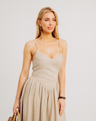 The CAMILA DRESS is a fresh take on linen sophistication. Crafted in a breathable linen fabric, it features a structured paneled bodice that flatters the waist, while the skirt is softly ruffled and flared for effortless movement. The midi silhouette strikes the perfect balance between elegance and ease. A discreet invisible side zipper and full lining ensure a smooth, comfortable fit from sunlit outings to evening plans.