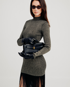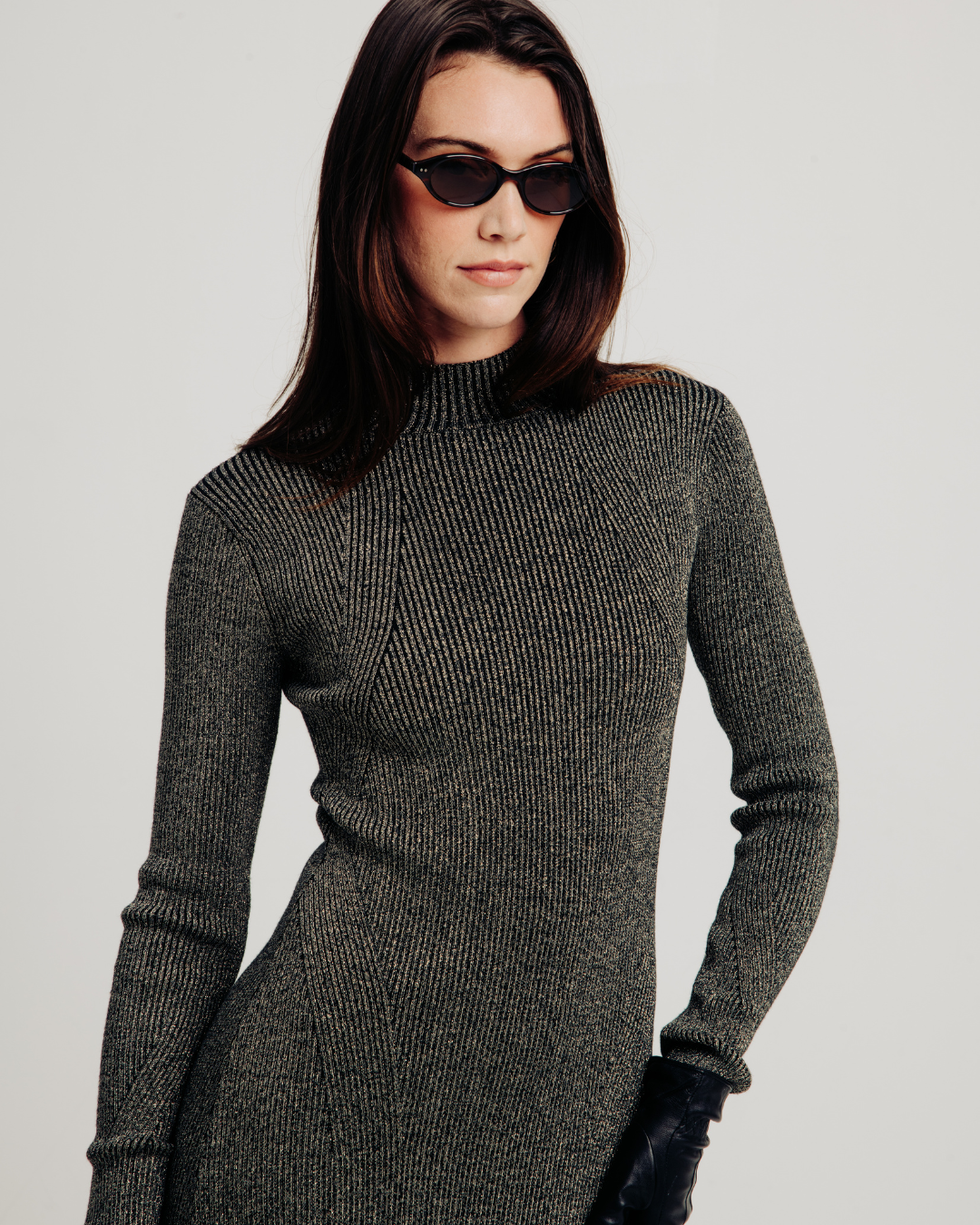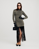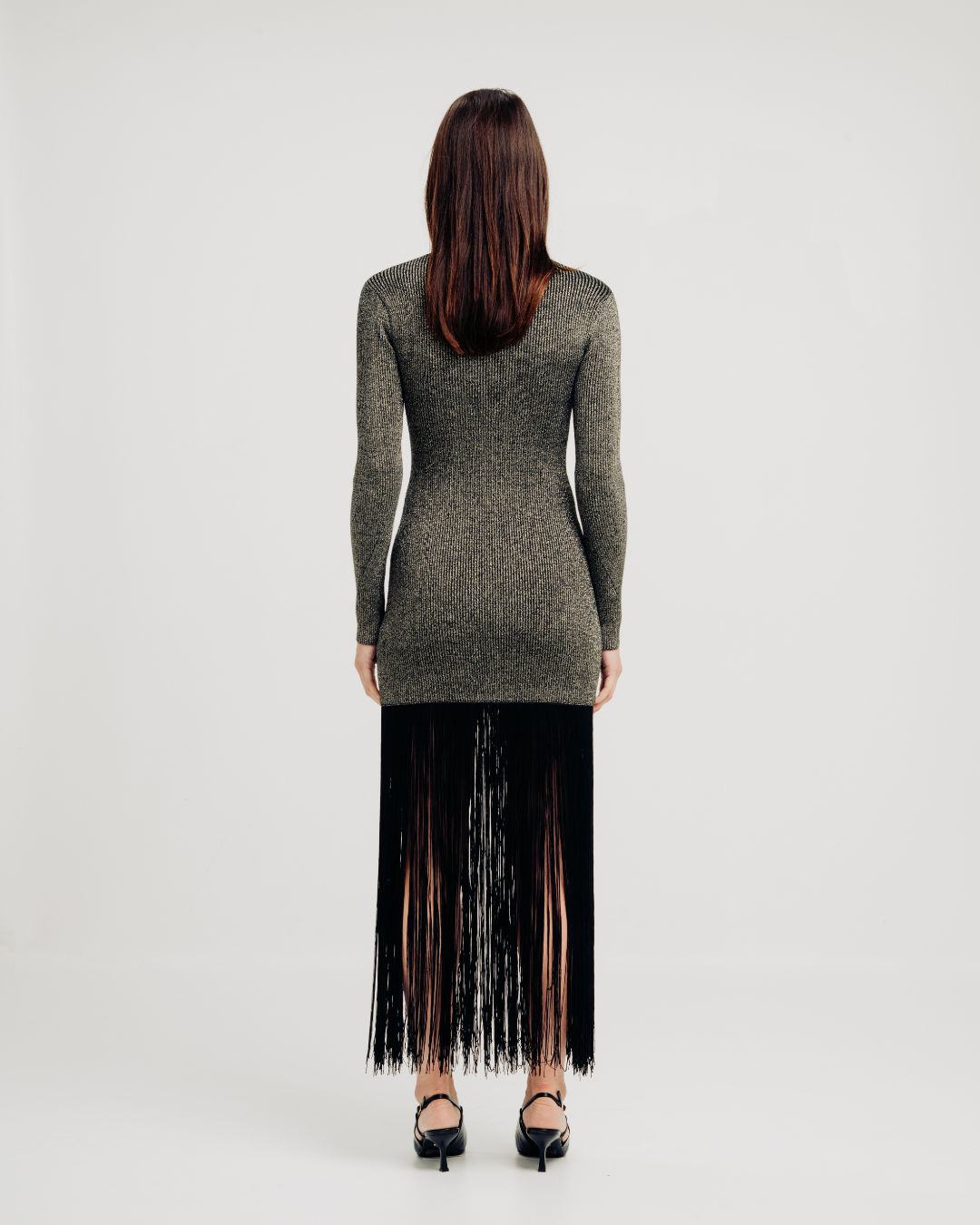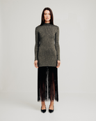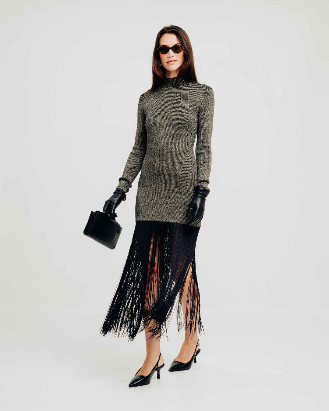 The Inara Dress stands out with its refined silhouette and modern shimmer. This metallic midi knit dress features a sleek mock neckline, long sleeves, and fully fashioned armholes and body detailing—delivering exceptional structure and seamless elegance. Its rib-stitch body adds subtle texture and stretch, while the dramatic long fringe trim at the bottom hem introduces graceful movement and a fashion-forward edge.