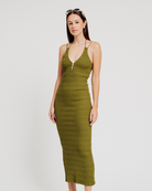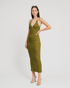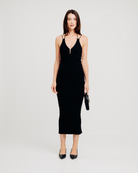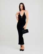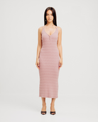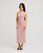 The Ingrid Dress is a beautifully textural midi knit that radiates refined femininity. Crafted with a rib body overlaid with delicate pointelle, this dress balances structure and a soft, breathable knit pattern. The low V-neck is accented with three pearl buttons, bringing a chic, vintage-inflected focal point to the front. Dual double straps in front offer added support and visual layering. At the back, a low V-neckline mirrors the front design, complemented by elegant tie-and-strap detailing and a subtle center-back slit for ease of movement and gentle drama.