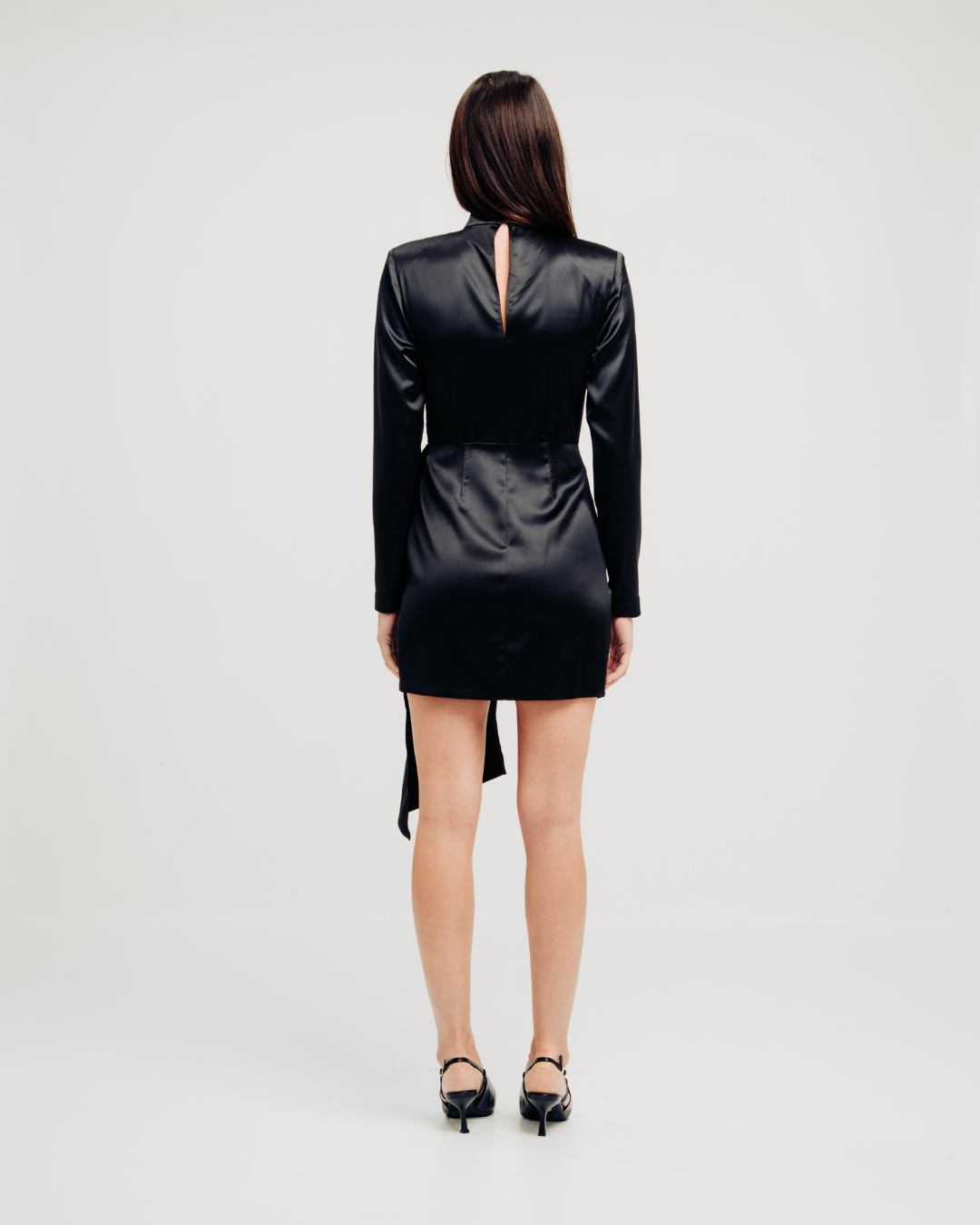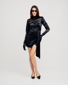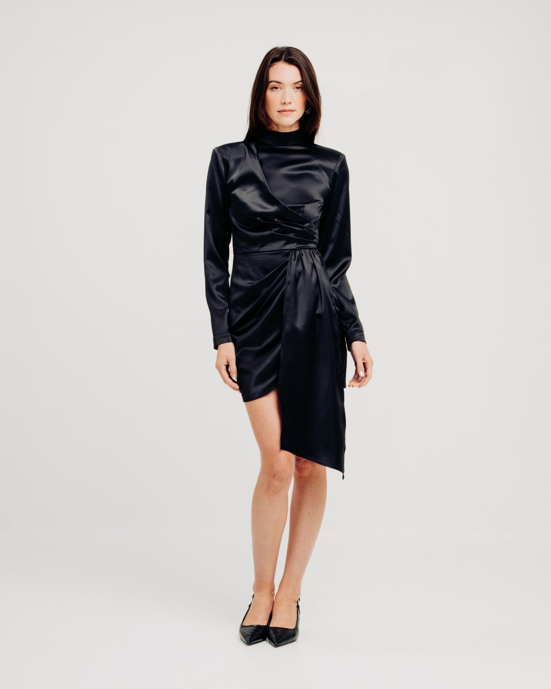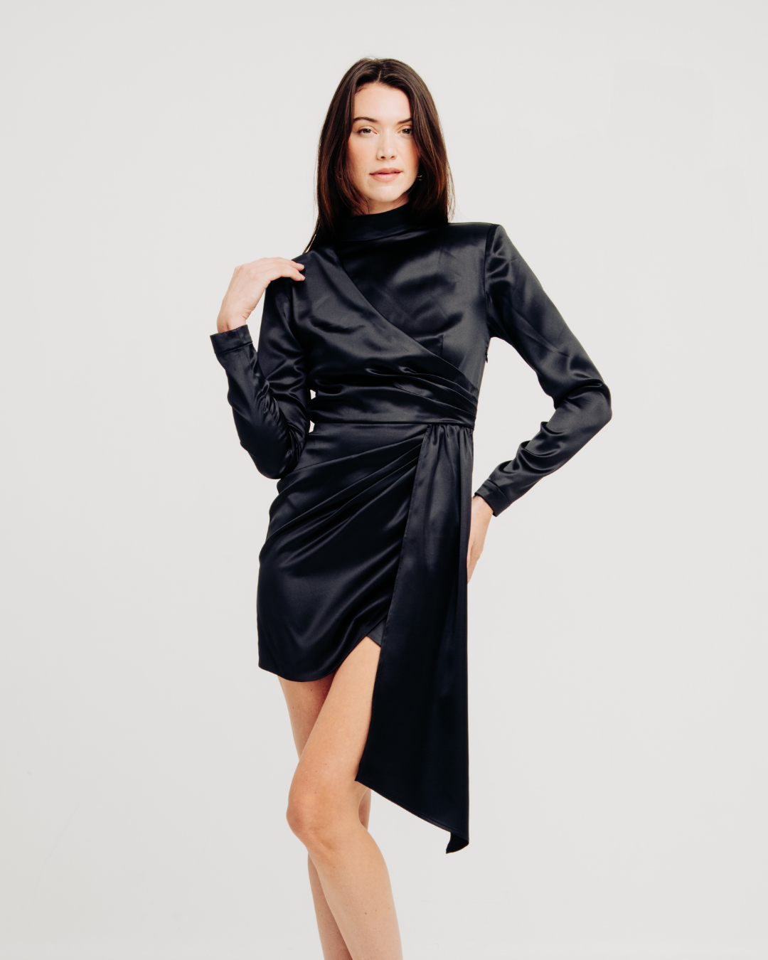 The Lara Dress masterfully melds bold tailoring with feminine grace. This mini dress features structured padded shoulders, a sleek mock neckline, and a front wrap panel that elegantly drapes into a sash on the skirt, offering refined movement and shape. Long sleeves lend balanced coverage, while a chic back keyhole adds intrigue. Built for seamless wear, this piece includes a side-seam invisible zipper with hook-and-eye closure and is fully lined for comfort and polish.