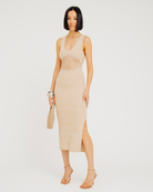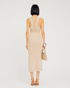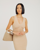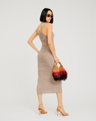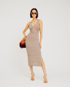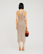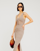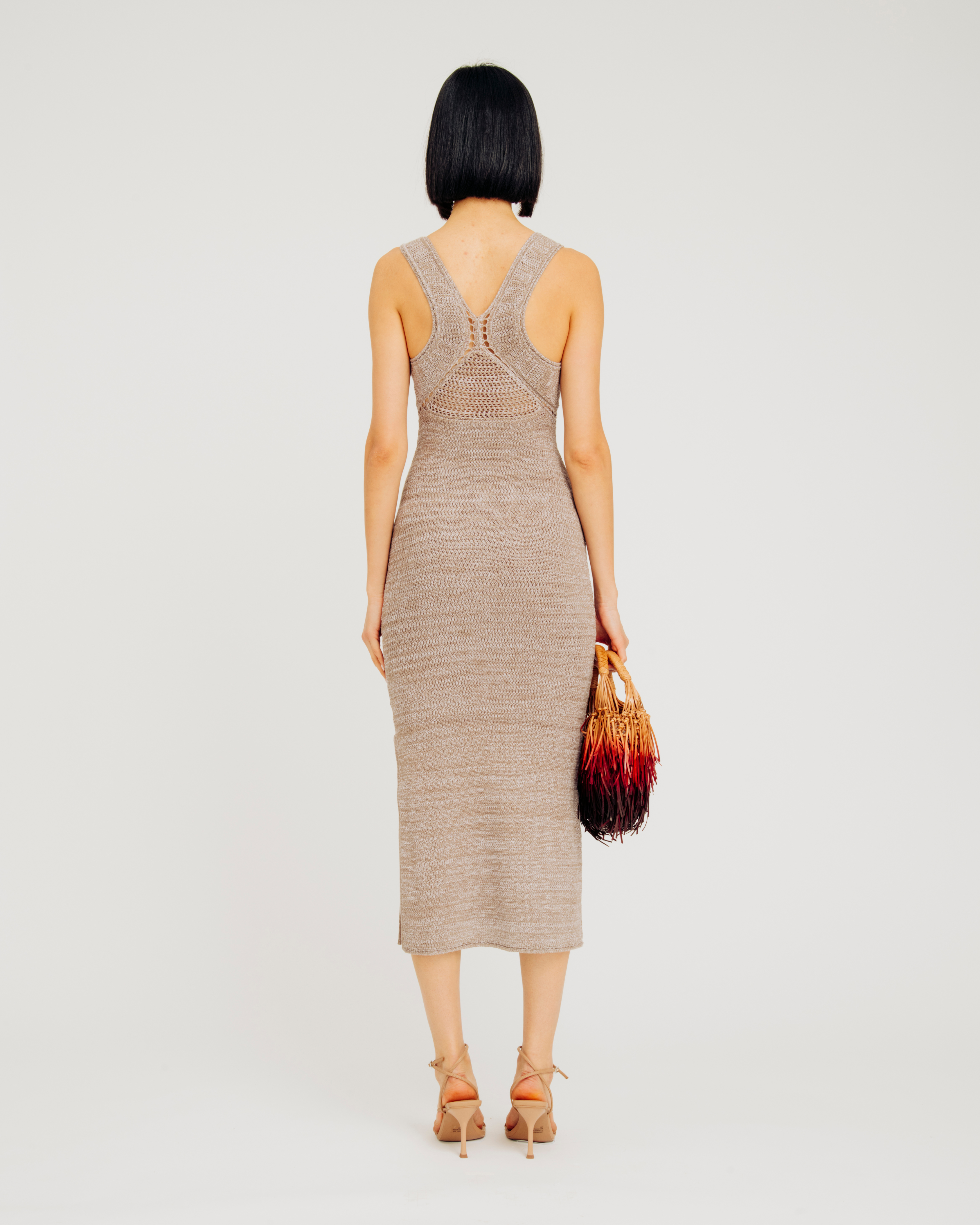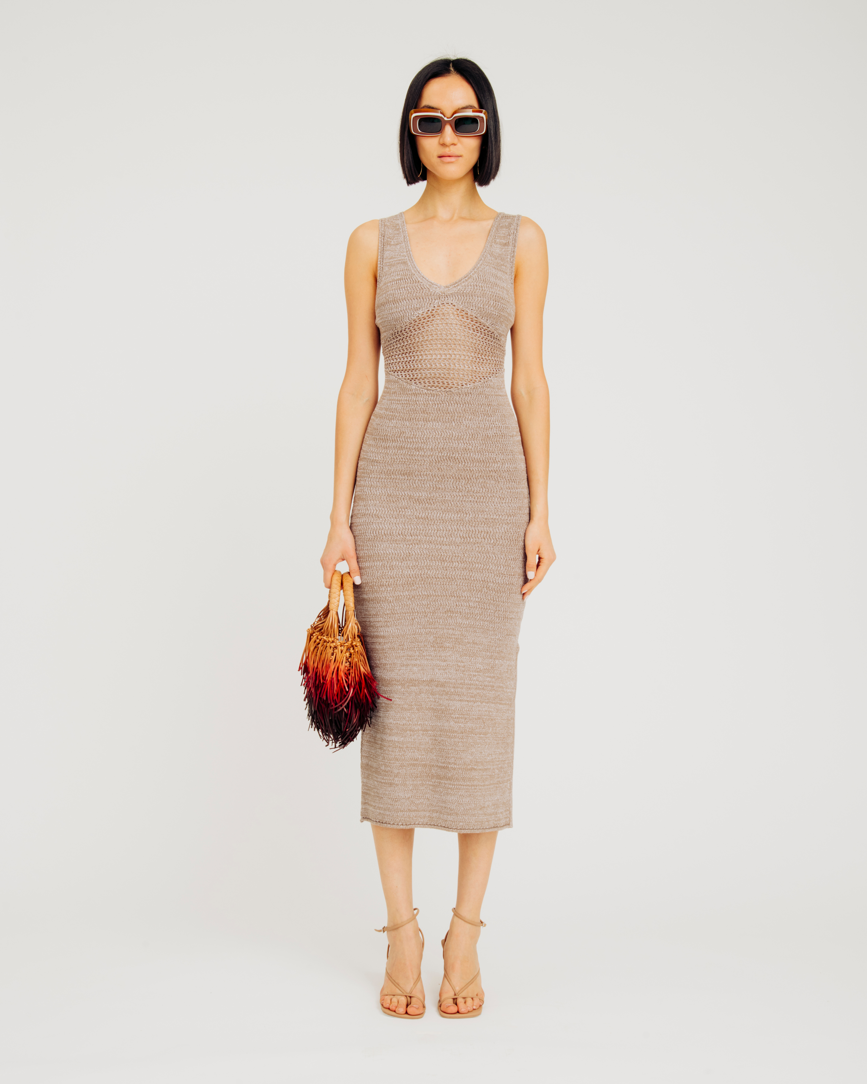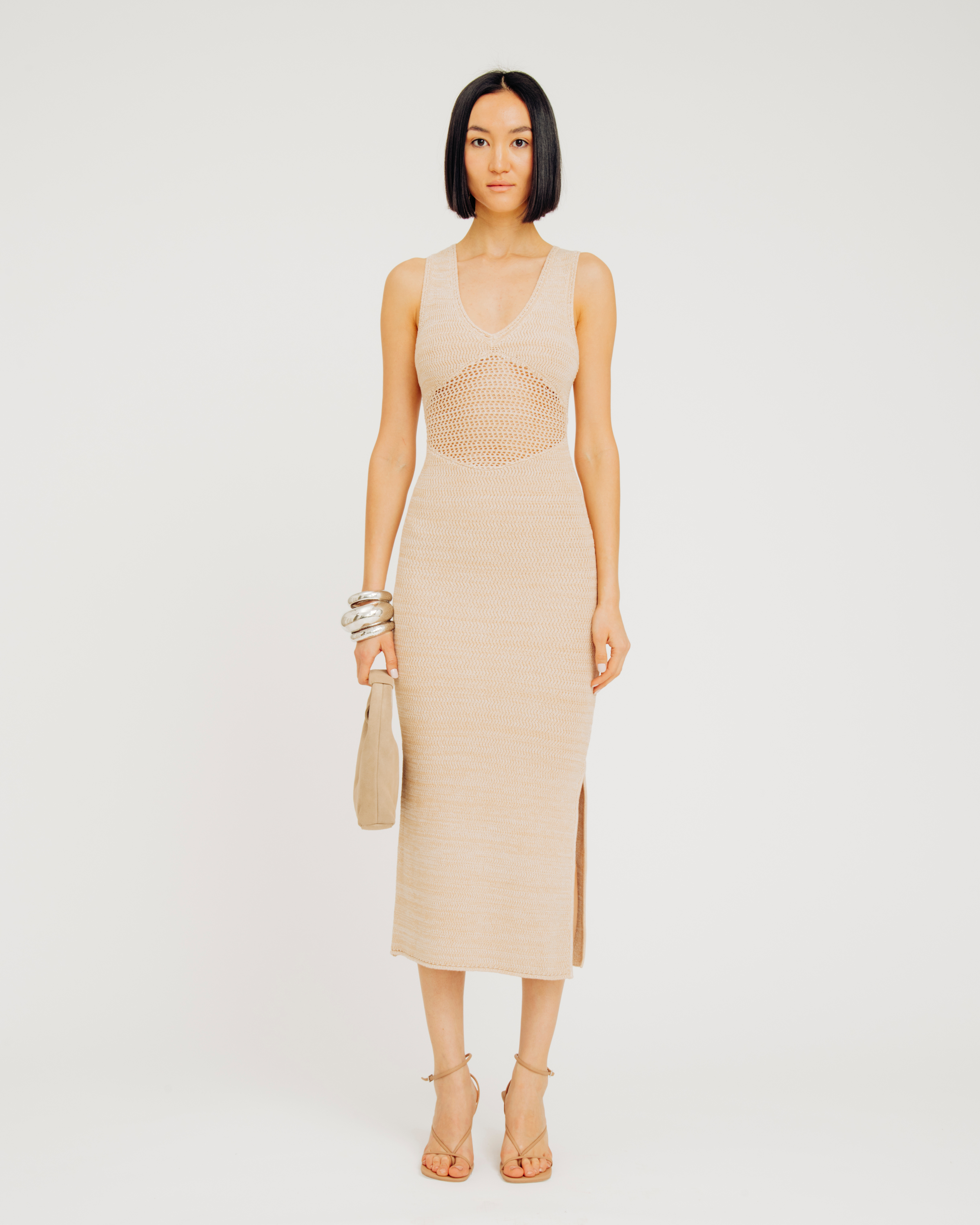 The Melanie Dress—a body-hugging knit that features a fully fashioned knit with a crochet stitch that clings in all the right places. The deep V-neckline teases just enough, while a racerback adds a sporty edge. A side slit brings movement, while contrast stitch detailing at the waist cinches the silhouette.
