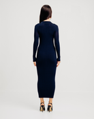 The Suri Dress is a sophisticated and versatile midi knit dress featuring a refined polo collar with stand, crafted to lay beautifully along a flattering low V‑neckline. Expertly tailored with fully fashioned armholes, this dress provides a seamless fit and structured silhouette. The rib body knit offers texture and a sleek, figure-skimming shape, while the long sleeves make it the perfect transitional piece—ideal for layering or wearing solo.