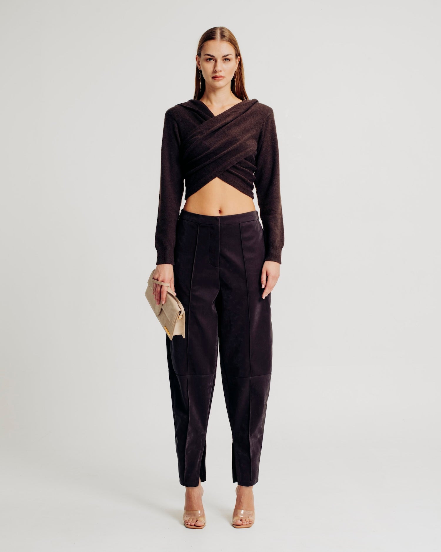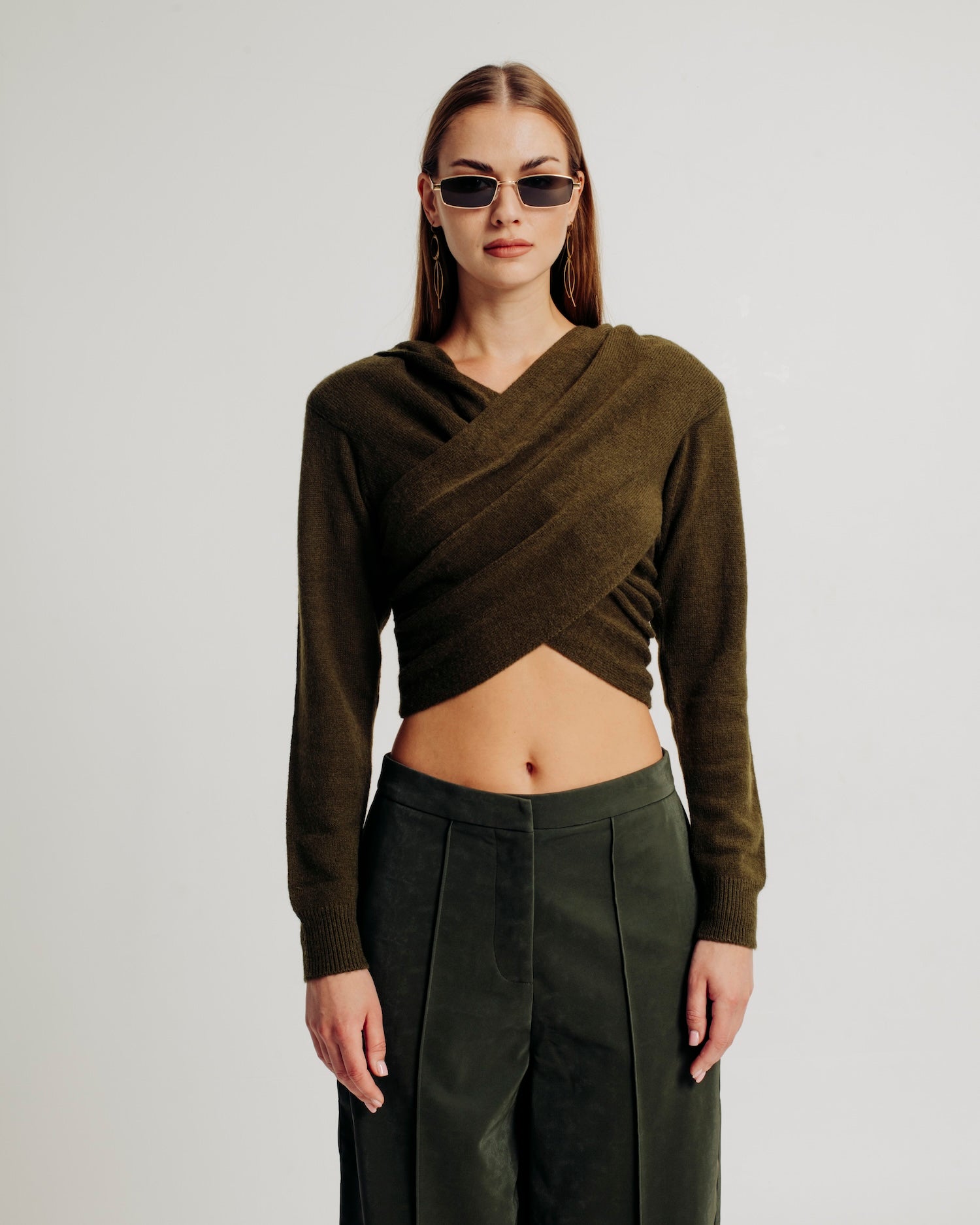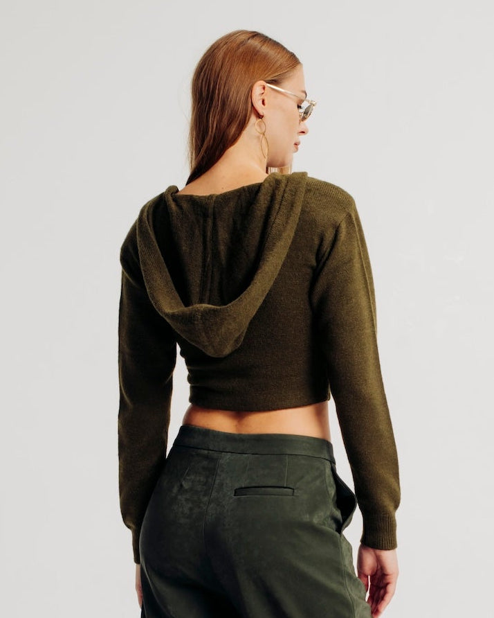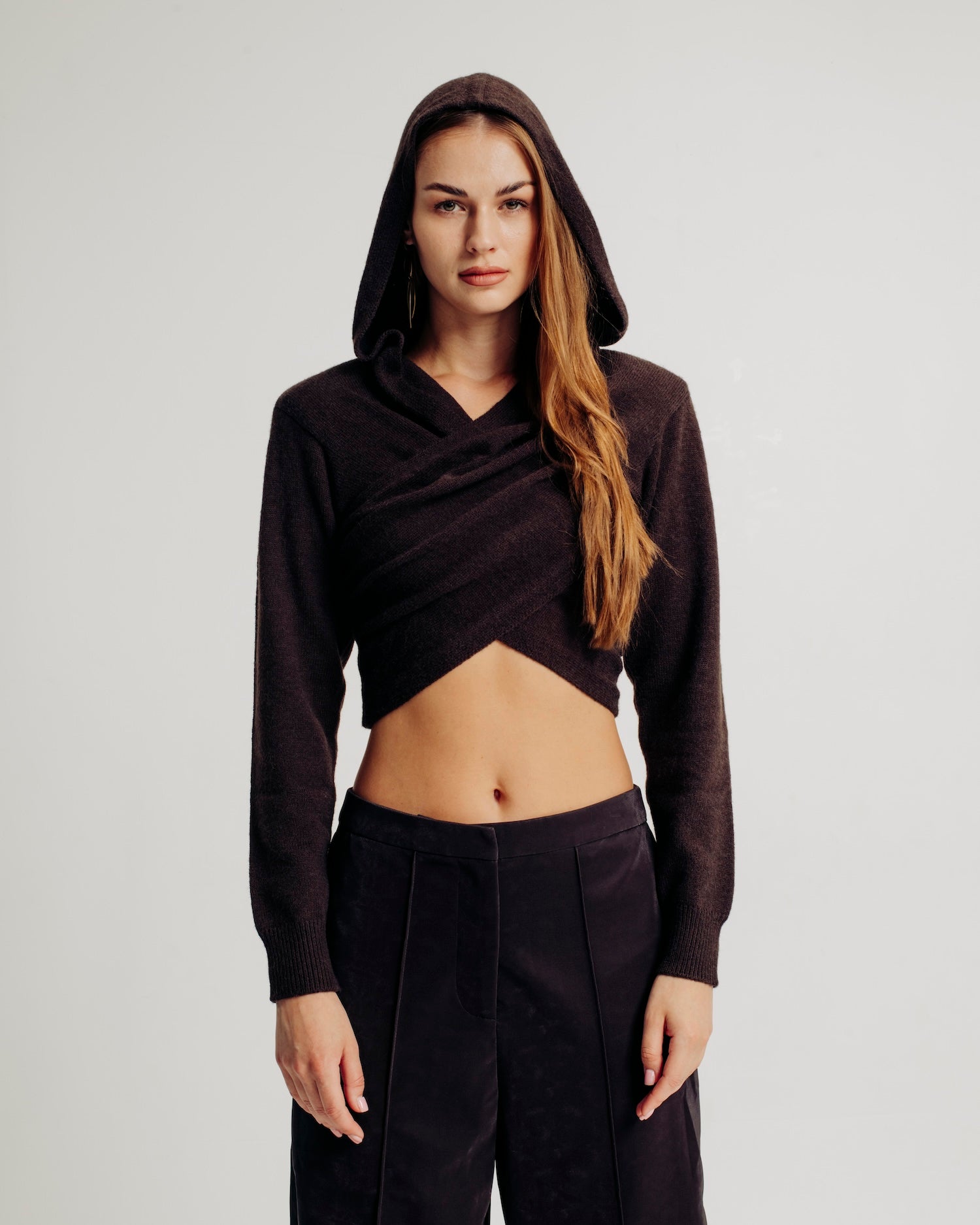 The Kimara top is a stylish and contemporary piece featuring a fully fashioned knit design. It boasts an oversized hood that adds a casual yet chic vibe. The front of the top showcases a ruched wrap detail, creating a flattering and unique silhouette. Additionally, the top is equipped with shoulder pads, giving it a structured and bold look. This combination of elements makes the Kimara top a versatile and statement-making addition to any wardrobe. Pair with the Kimara Pant for the full look.