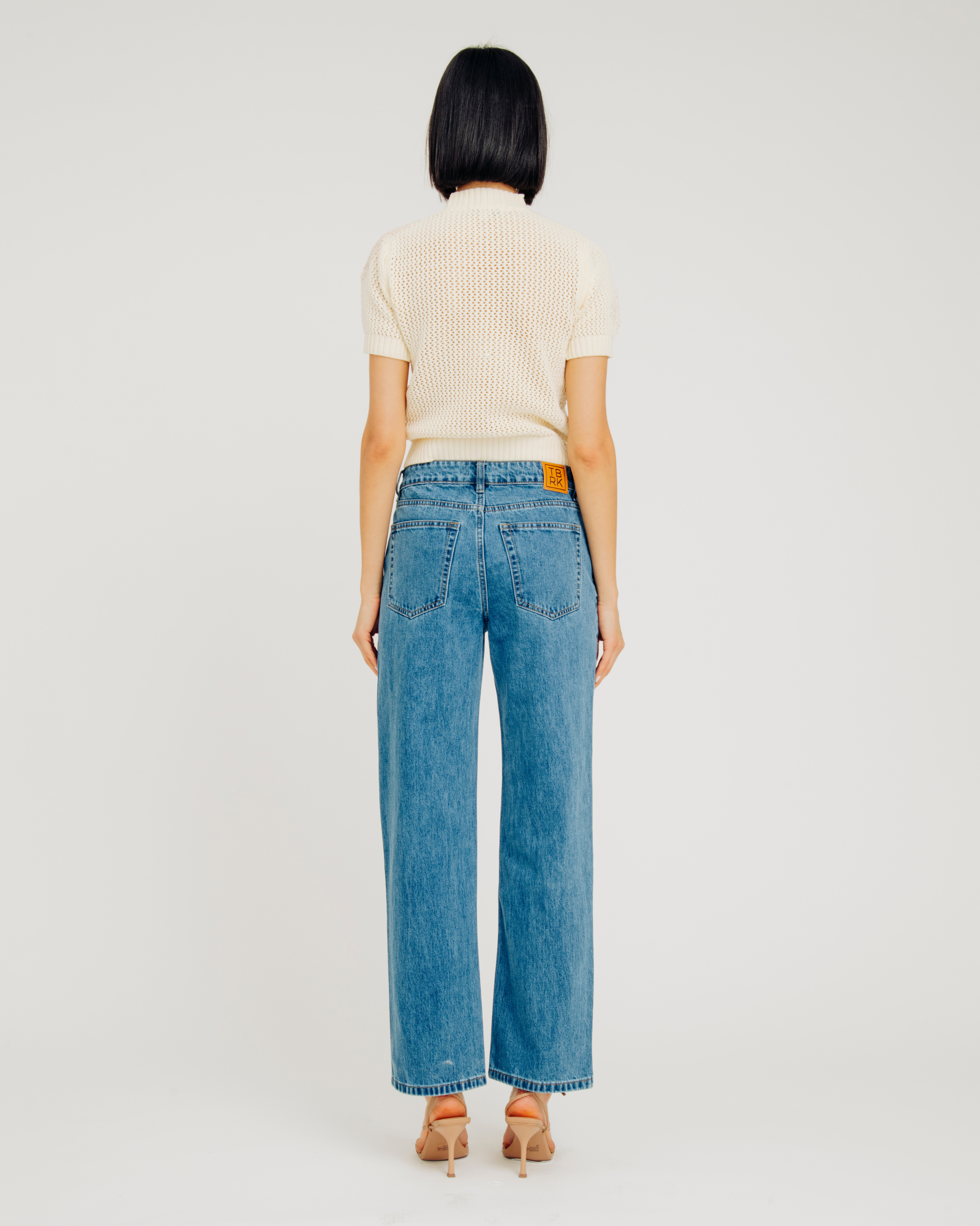 The Janis Jean in Medium Wash is a mid-rise fit and rigid denim create a structured silhouette, while the straight-leg cut keeps it effortlessly cool. With bold crochet patchwork with raw frayed edges, adding just the right amount of detail. Finished with a front fly zipper closure and back patch pockets, pair it with the Janis Sweater and sky-high heels.