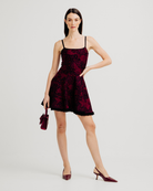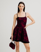 Turn every head with the Liza Dress, a daring mini-length silhouette crafted in a rich knit jacquard featuring a unique leopard and butterfly print. Designed with thin neckline straps for a clean, elevated neckline, this dress cinches at the top and flares into a voluminous skirt, finished with a playful fringe hem. The deep red tones add richness and intensity, perfect for night-outs, cocktail parties, or bold fashion statements.