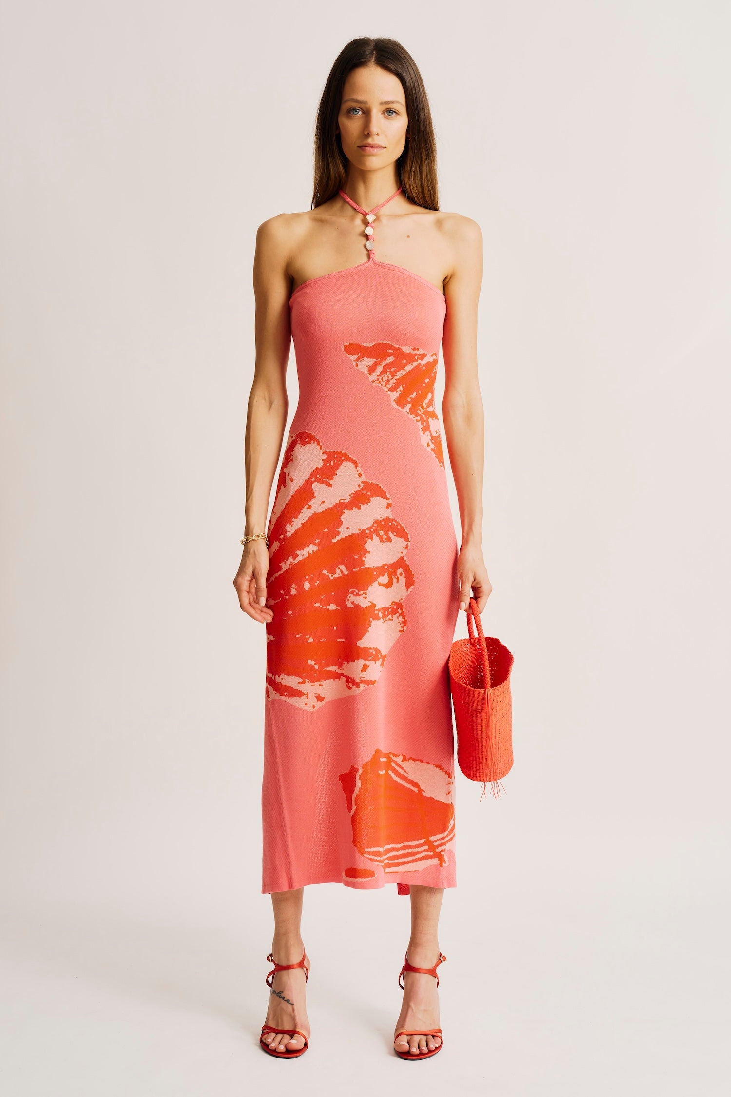 The Lola Dress from Torn by Ronny Kobo, a captivating embodiment of summer elegance and allure. Crafted from luxurious knit fabric, this stunning form-fitting dress features a shell design intricately worked into the fabric, adding a touch of texture and sophistication. The halter top with string neck detail is adorned with a beautiful beaded design, enhancing its chic and glamorous appeal. Whether you're attending a beach wedding or enjoying a sunset dinner, the Lola Dress is sure to make a statement with its effortless grace and timeless charm. Elevate your summer wardrobe with this chic and versatile piece from Torn by Ronny Kobo.