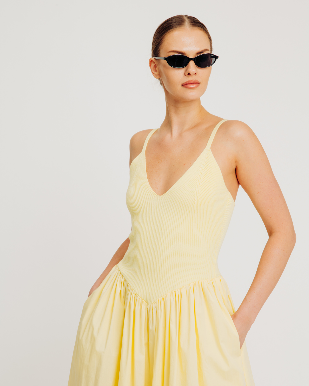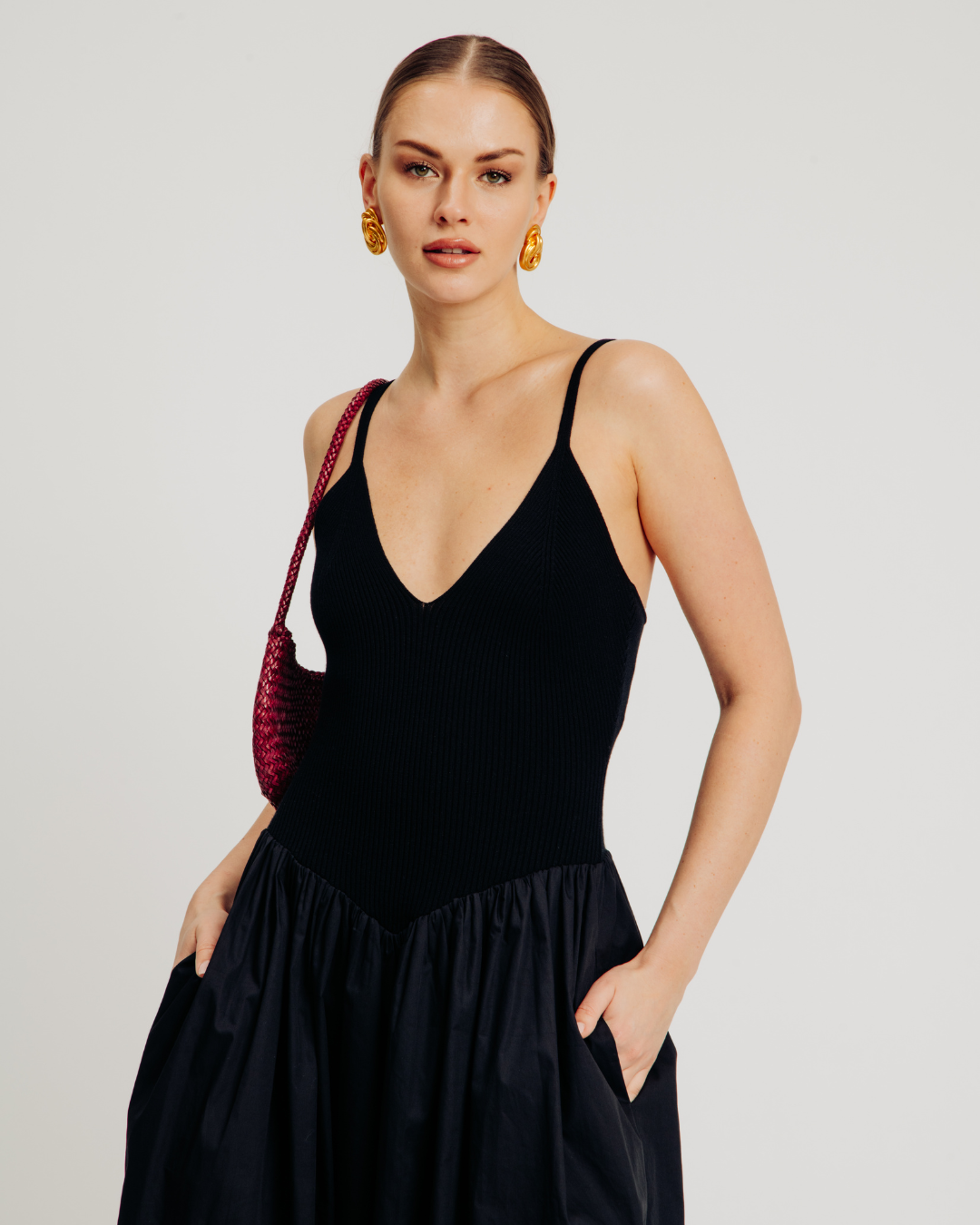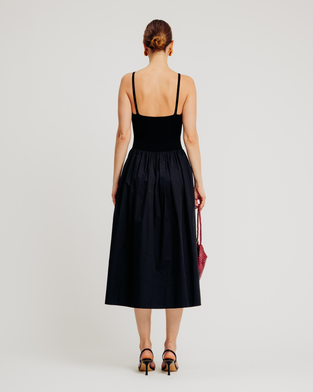 The Monica Dress features a midi-length silhouette with a viscose rib knit bodice and cotton poplin skirt for a modern mixed-texture design. Styled in an easy pullover fit, it includes fully fashioned rib detailing at the bust for a flattering shape, a full skirt for effortless movement, and hidden side seam pockets for added functionality and everyday elegance.