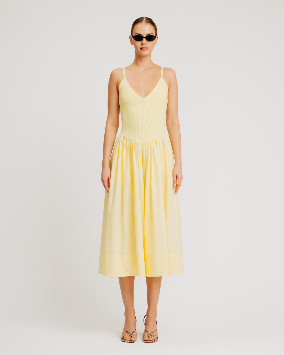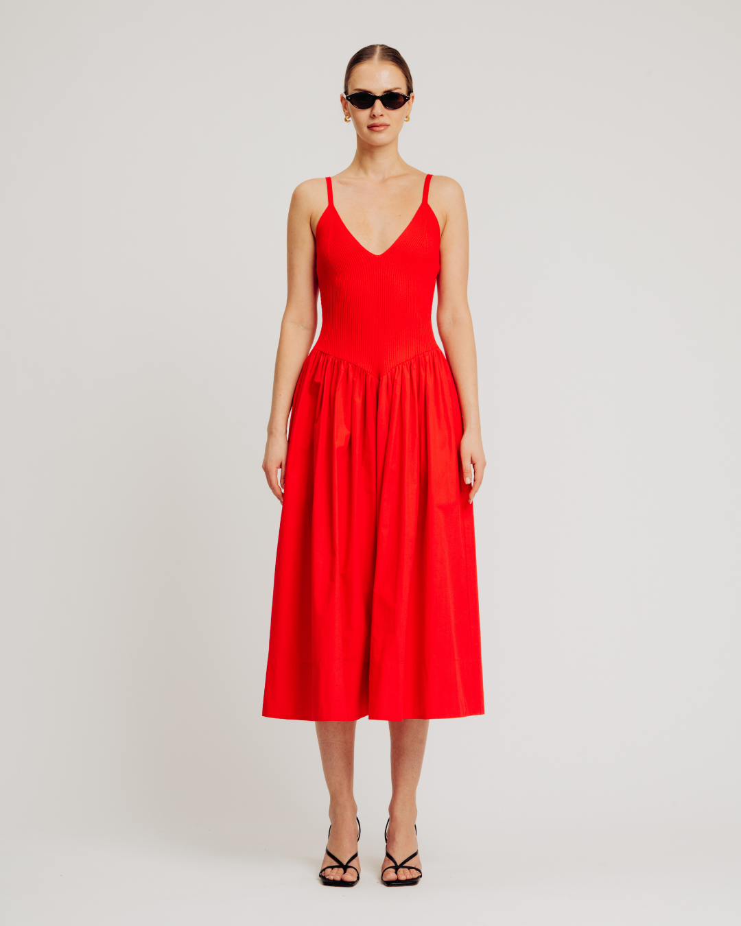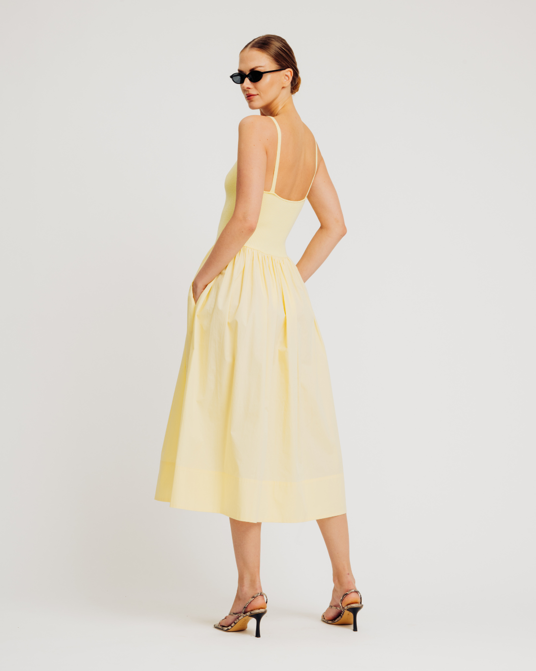 The Monica Dress features a midi-length silhouette with a viscose rib knit bodice and cotton poplin skirt for a modern mixed-texture design. Styled in an easy pullover fit, it includes fully fashioned rib detailing at the bust for a flattering shape, a full skirt for effortless movement, and hidden side seam pockets for added functionality and everyday elegance.