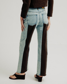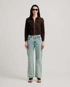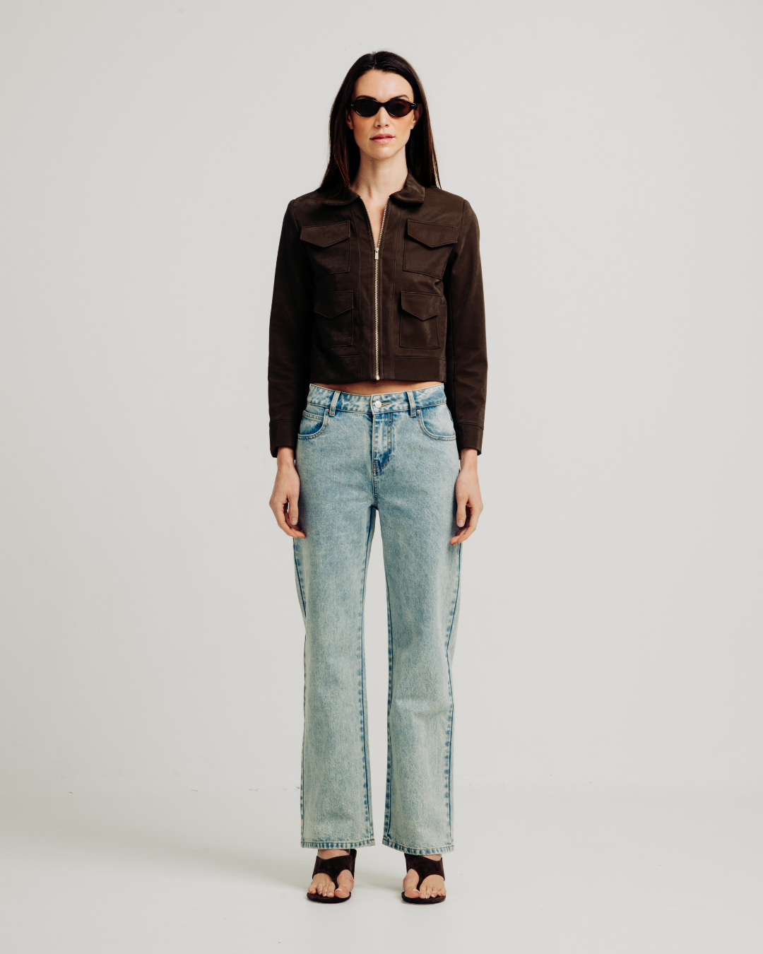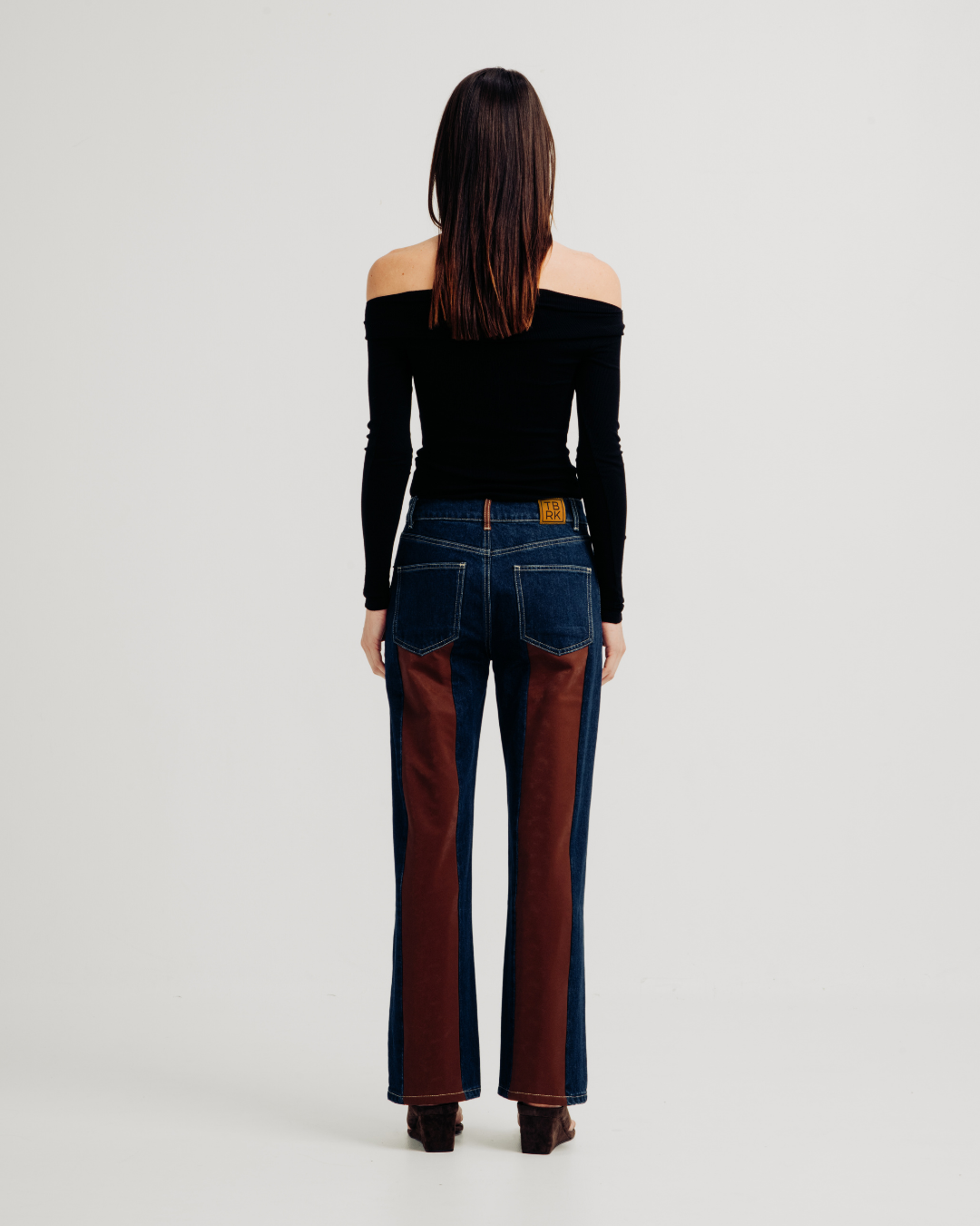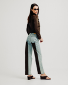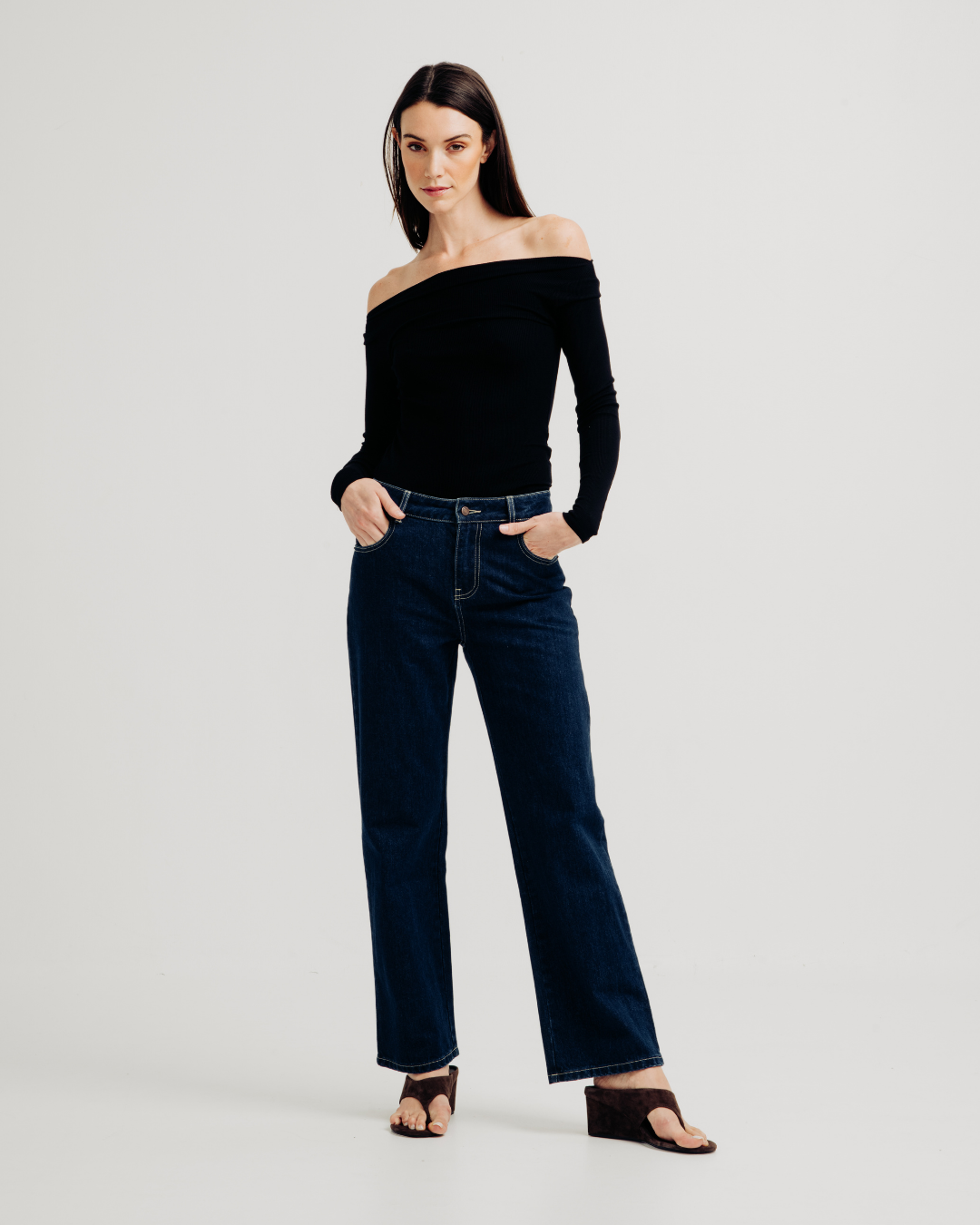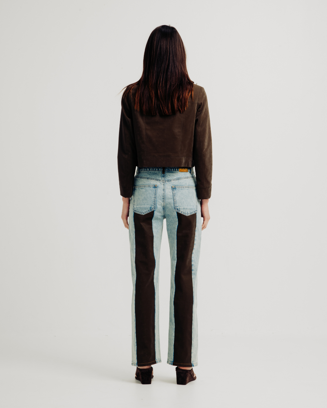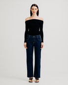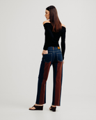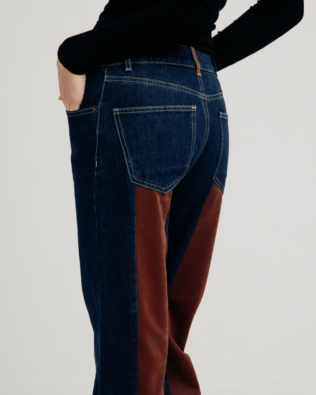 The Yana Jeans bring subtle sophistication to timeless denim. Featuring a high-rise waist, these jeans offer flattering coverage and a streamlined silhouette. The leg is a clean straight cut, offering versatility across footwear and styling. Details include a metal shank button at the waistband, fly front with metal zipper, curved front pockets plus a coin pocket, and back patch pockets. A standout feature? Elegant suede stripes along the back, adding tactile texture and unique visual interest. The double-layer self waistband with 5 belt loops reinforces structure and styling flexibility.