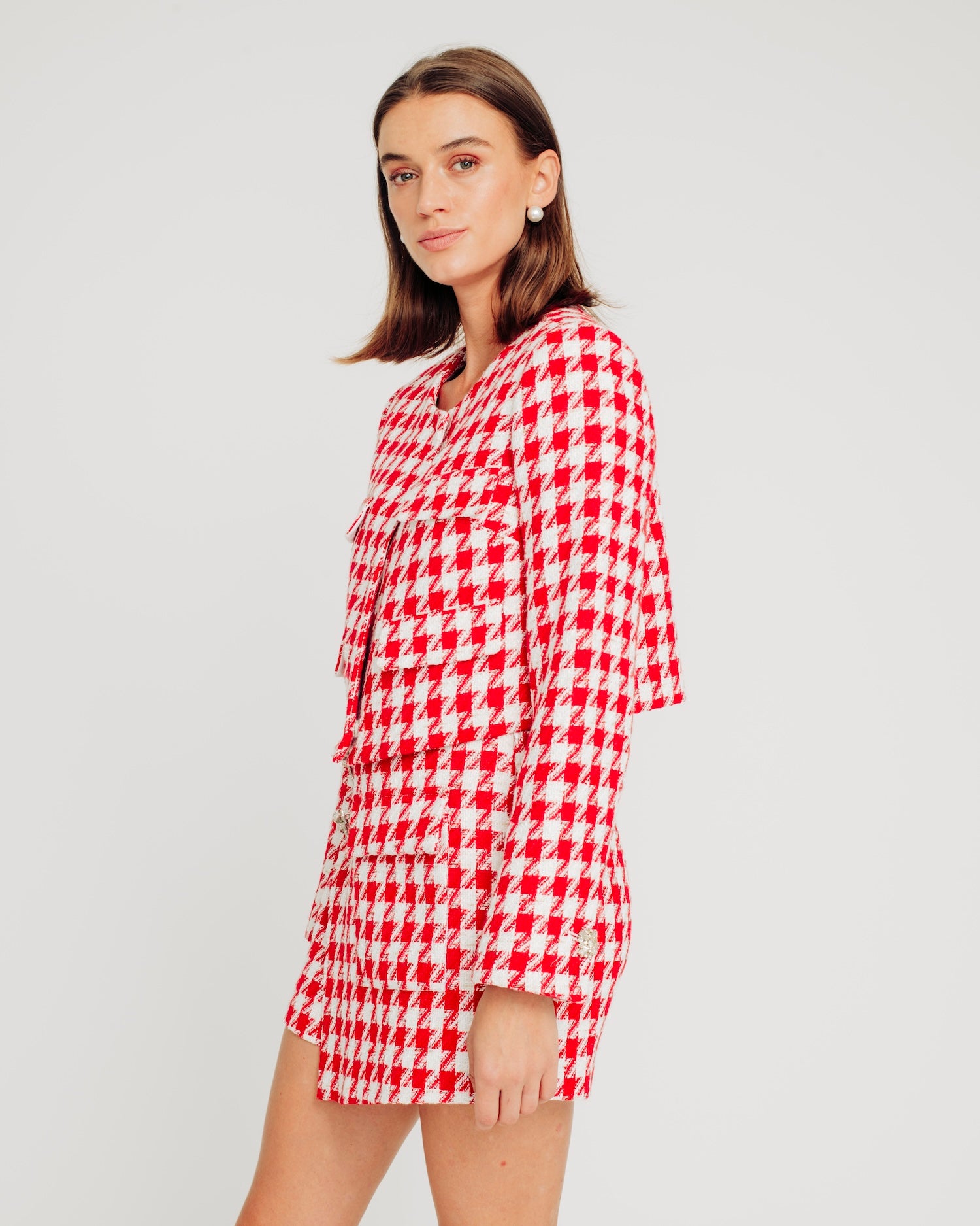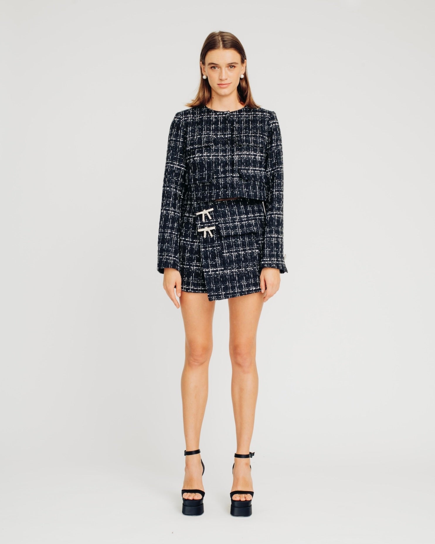 Coco Skort, a chic companion to its jacket counterpart with its Embellished Tweed design. This skort effortlessly captures the essence of glamour and individuality, featuring embellished details that add a touch of bold sophistication to the tweed texture. Perfect for those who embrace the fusion of modern edge and timeless elegance, the Coco Skort embodies the distinctive Torn by Ronny Kobo aesthetic. Elevate your wardrobe with this standout piece, where every thread tells a tale of confident style, making a statement that resonates with the unmistakable allure of Torn by Ronny Kobo.