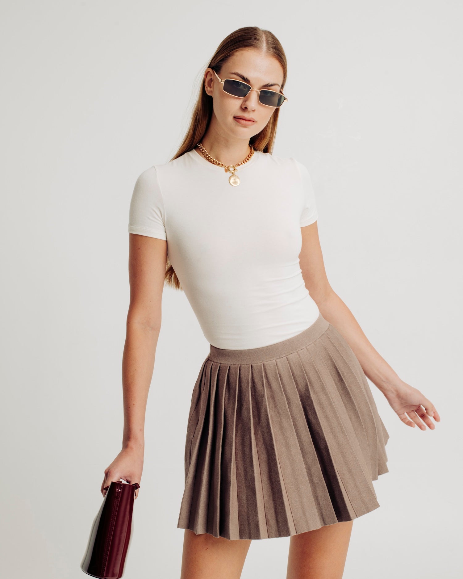 The Rosie Skirt is designed with a fully fashioned knit pleated construction, offering a graceful and textured appearance. It features an elastic pullover waistband for a comfortable and adjustable fit, seamlessly combining style and practicality.