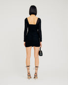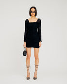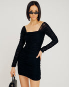 The Ariana Dress is crafted from sheer jersey that clings in all the right places, this mini dress is designed to sculpt and flatter. Allover ruching creates depth and movement, while sheer sleeves add an ethereal contrast to its structured square neckline. A concealed back zipper keeps the silhouette sleek, because the only thing that should stand out is you.