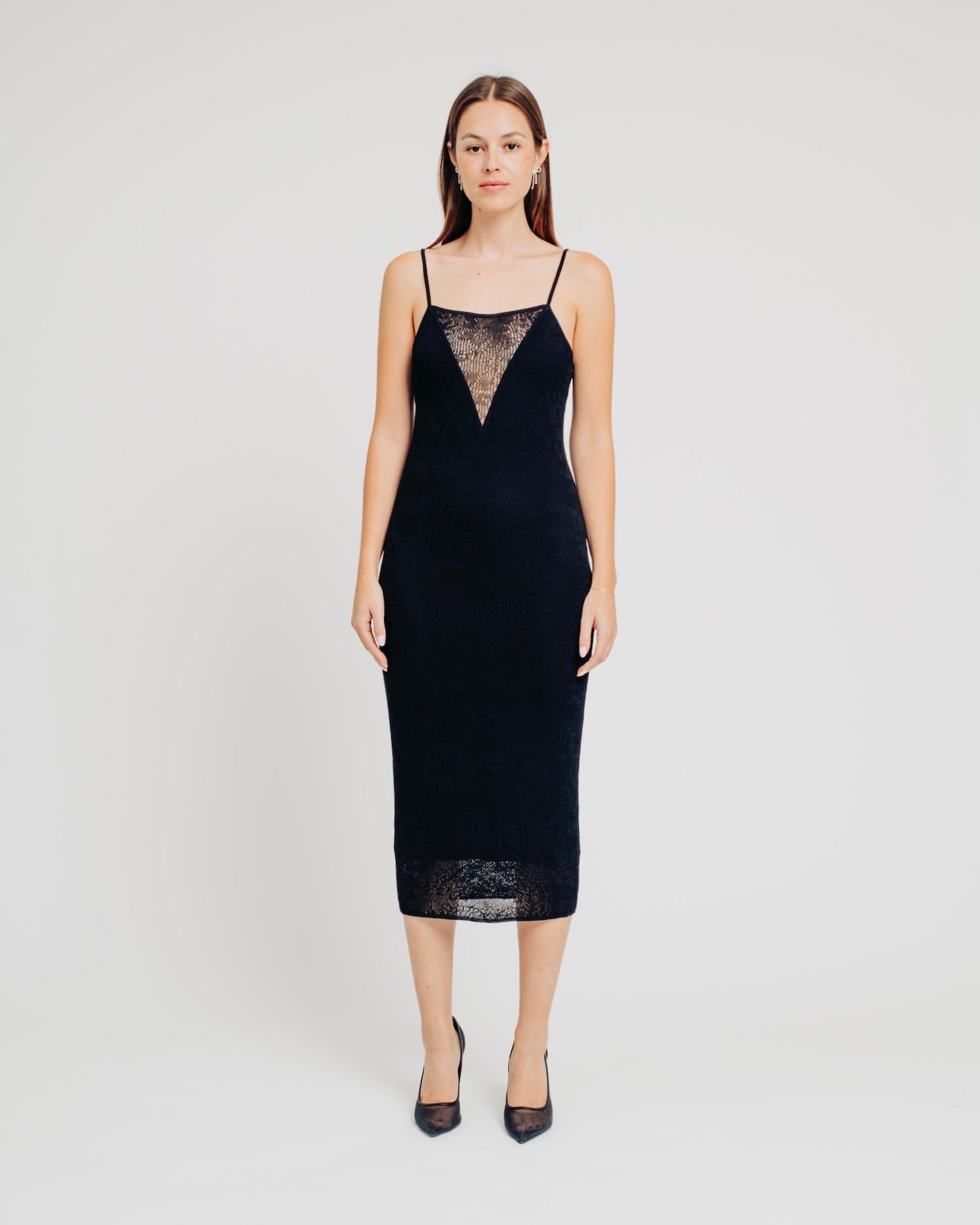 Elevate your style with the Delia Dress, a refined midi-length design crafted in delicate pointelle lace knit. Fully lined for comfort, this dress features a sheer V-shaped inset at the front neckline, adding a hint of allure to its classic silhouette. With its intricate lace detailing and timeless appeal, the Delia Dress is an elegant choice for any occasion that calls for sophistication.
