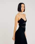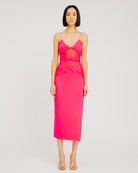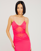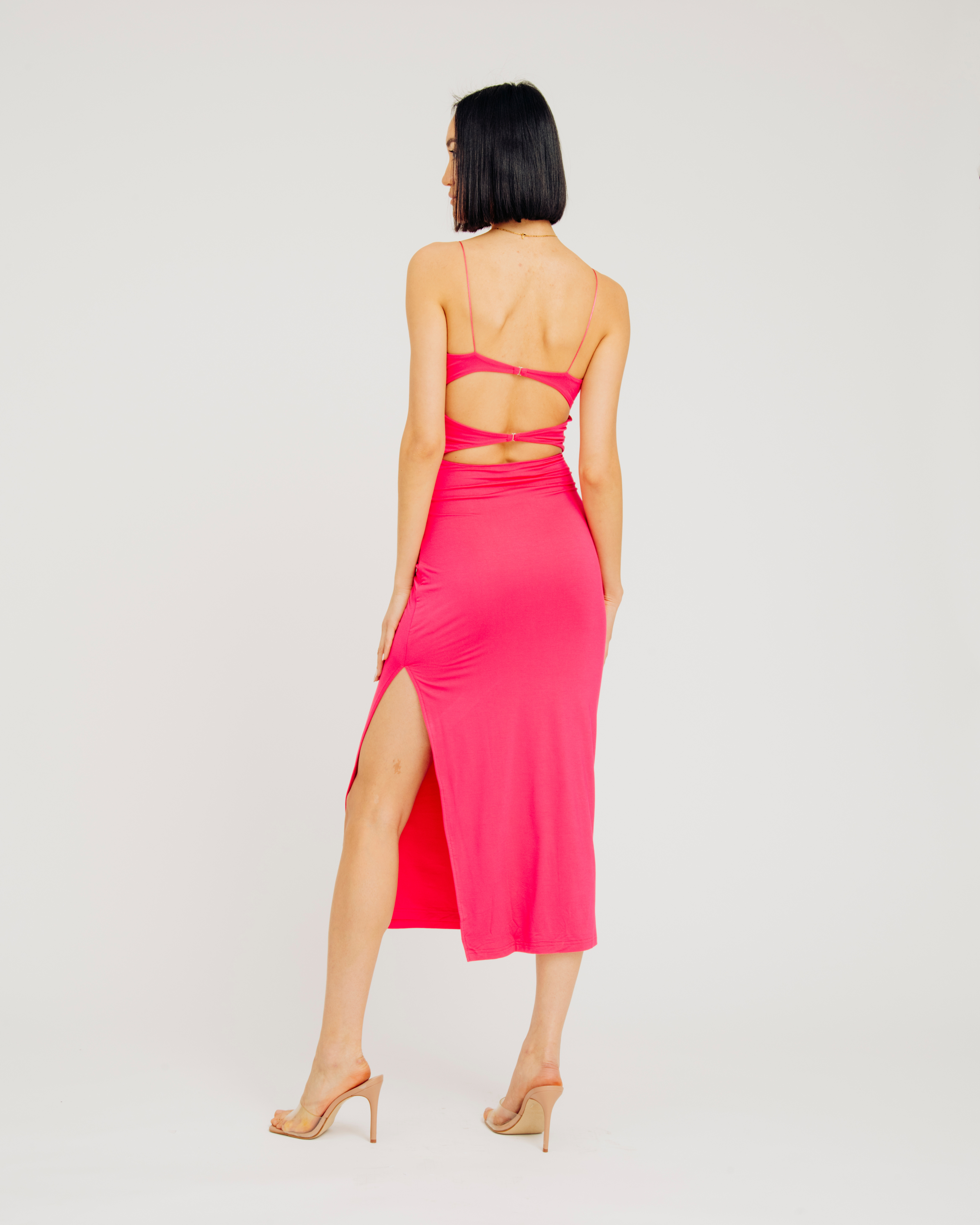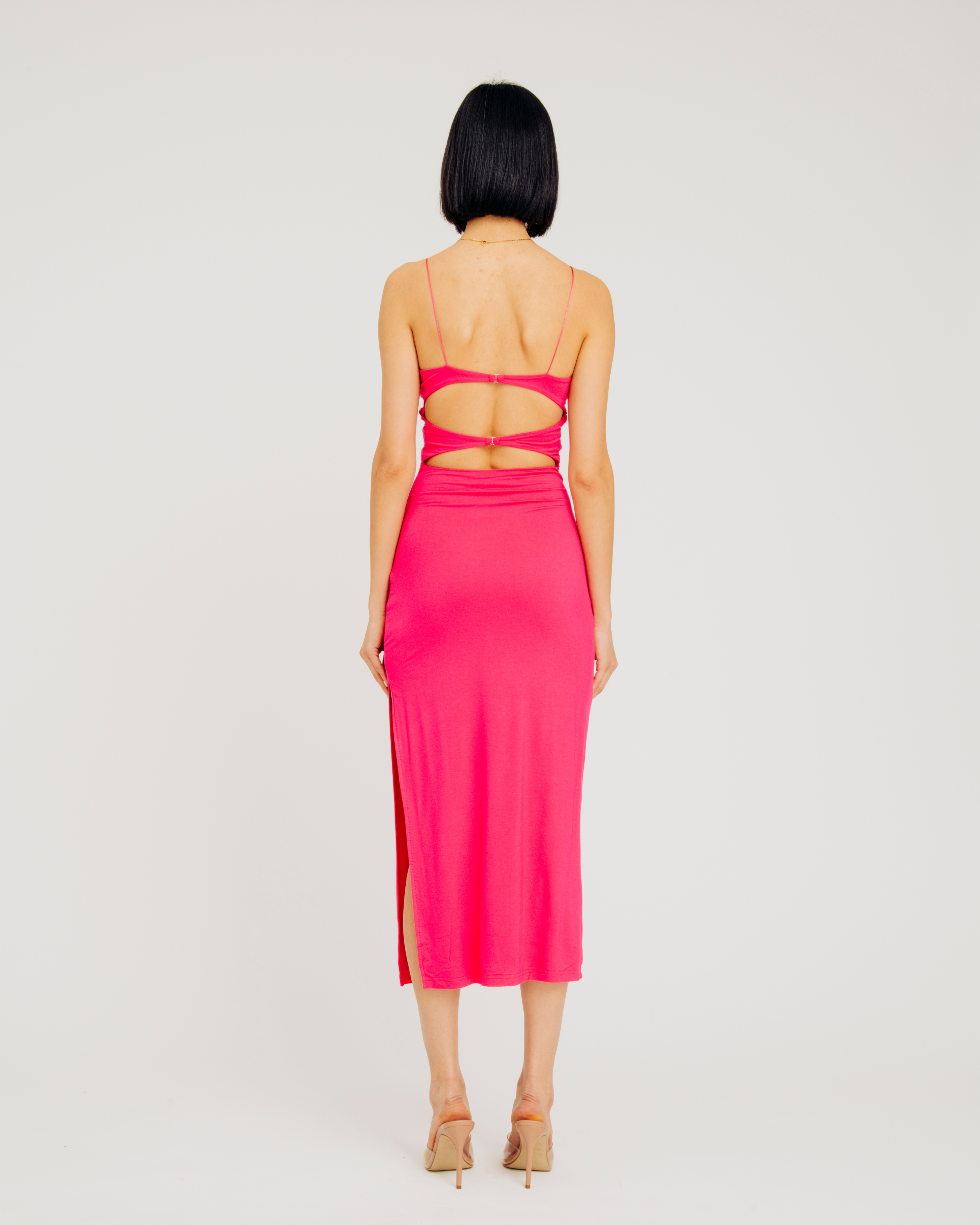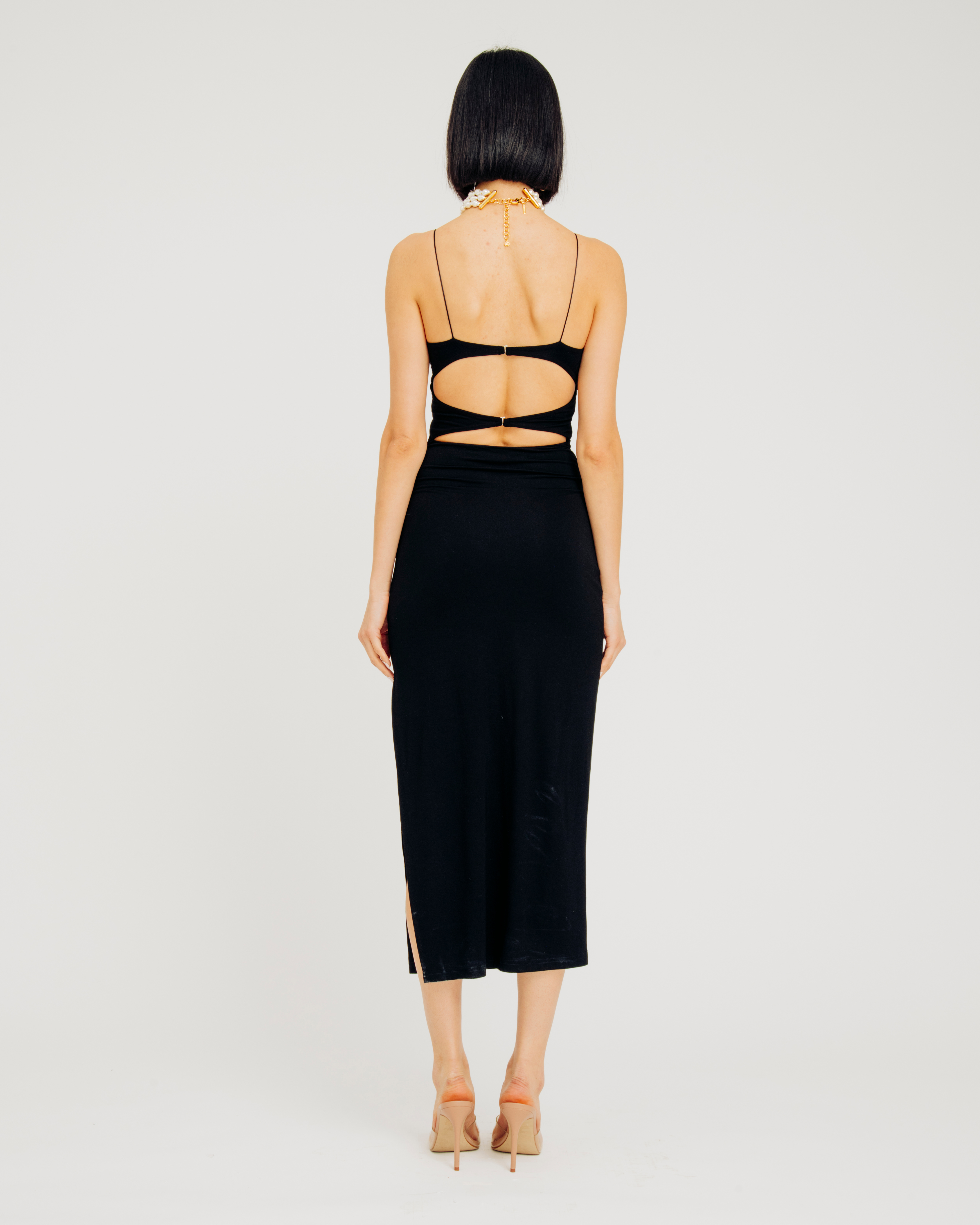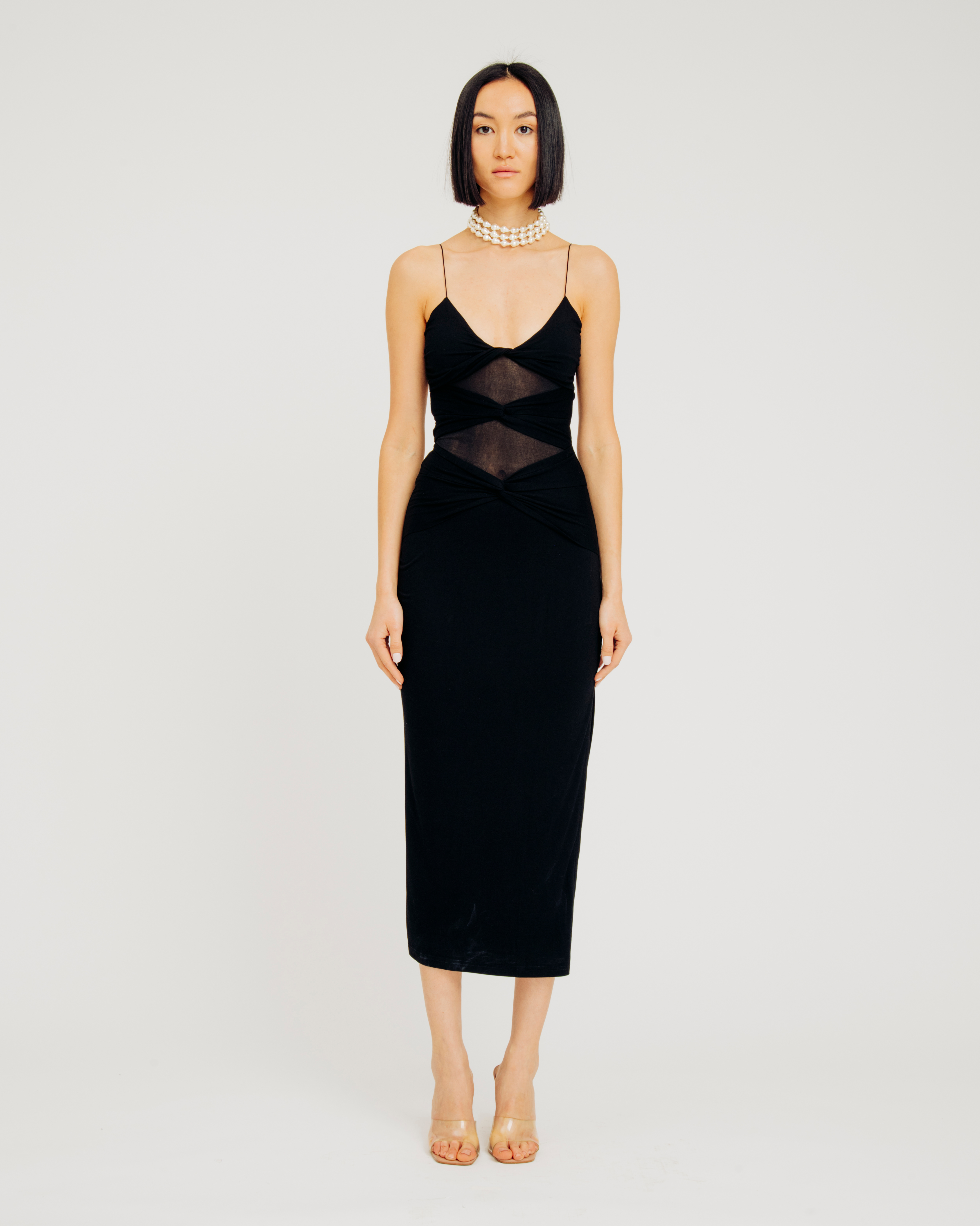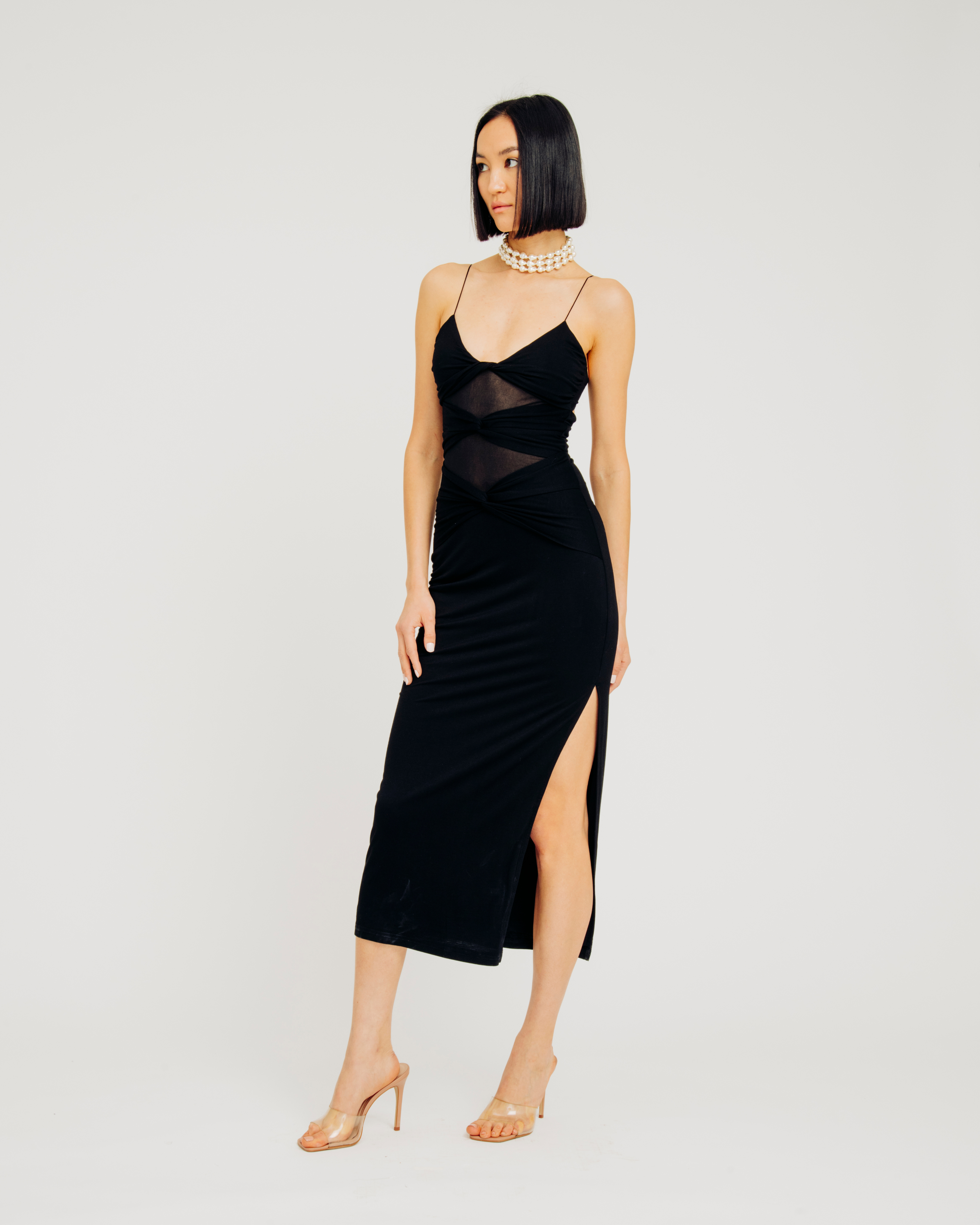 The Stevie Dress crafted from soft viscose jersey that drapes and clings in all the right places. A front twist detail shapes the silhouette, while a sheer inset at the waist adds just enough intrigue. The midi length keeps it refined, but the side slit brings the drama. Finished with hook-and-eye closures at the back for a seamless fit.