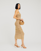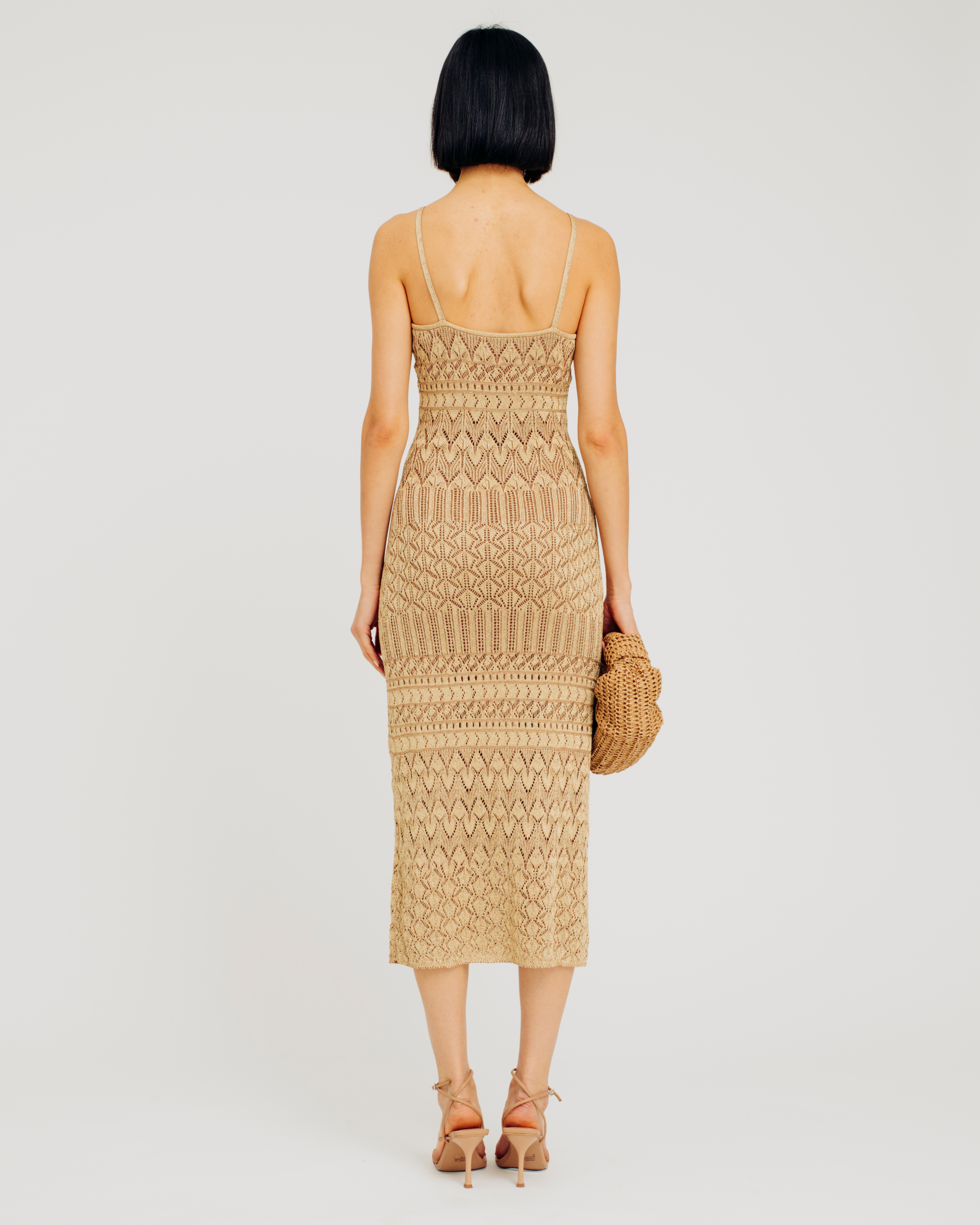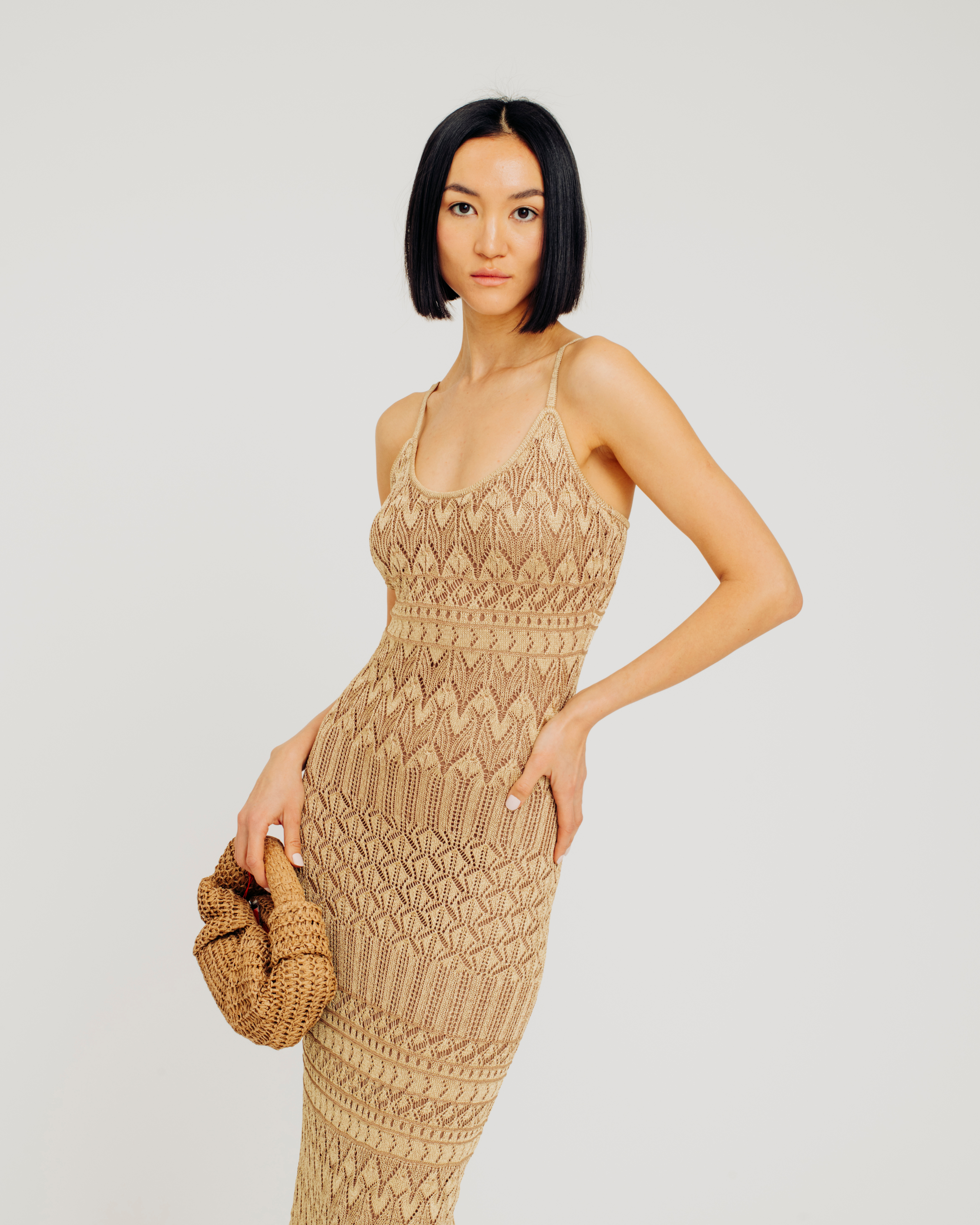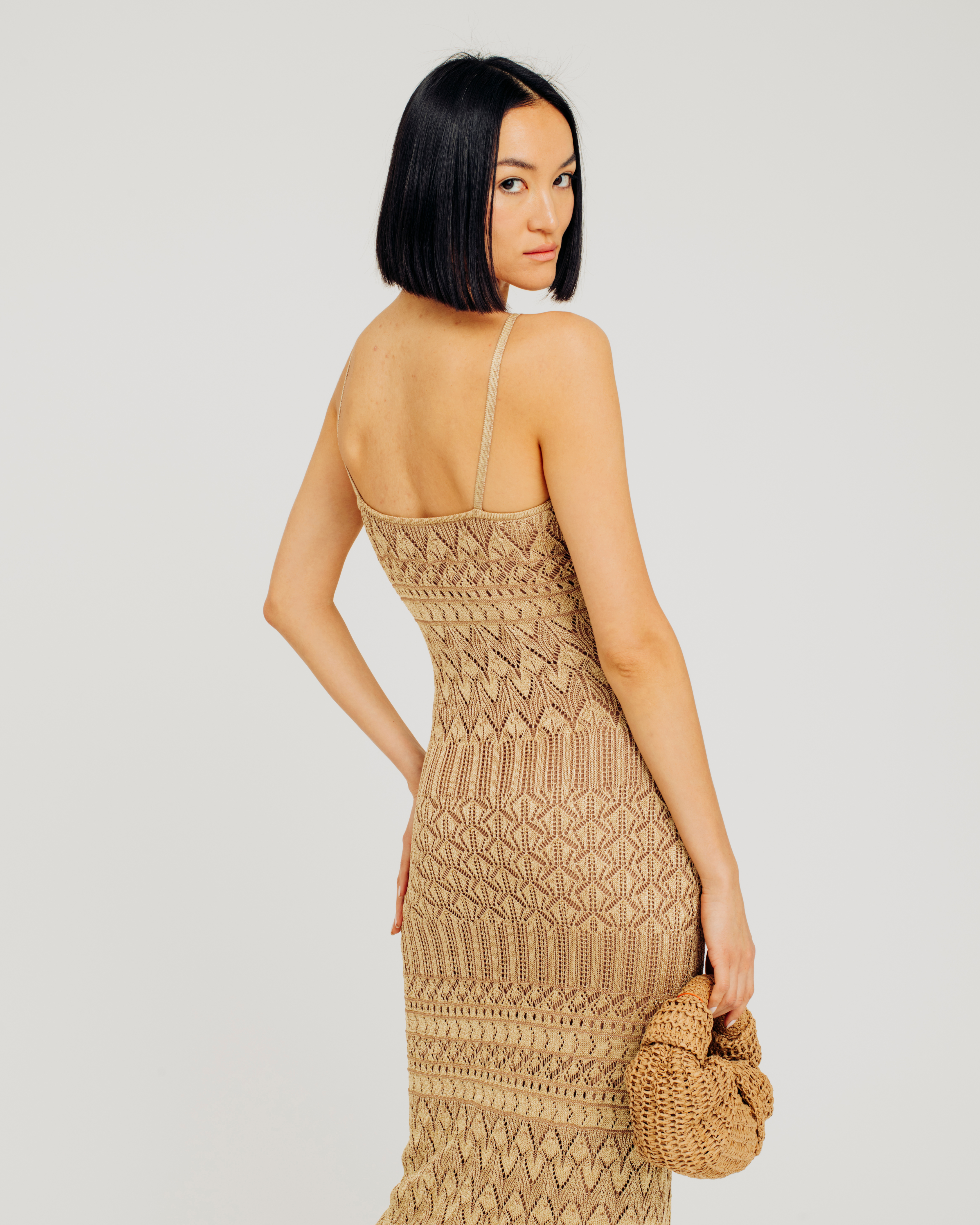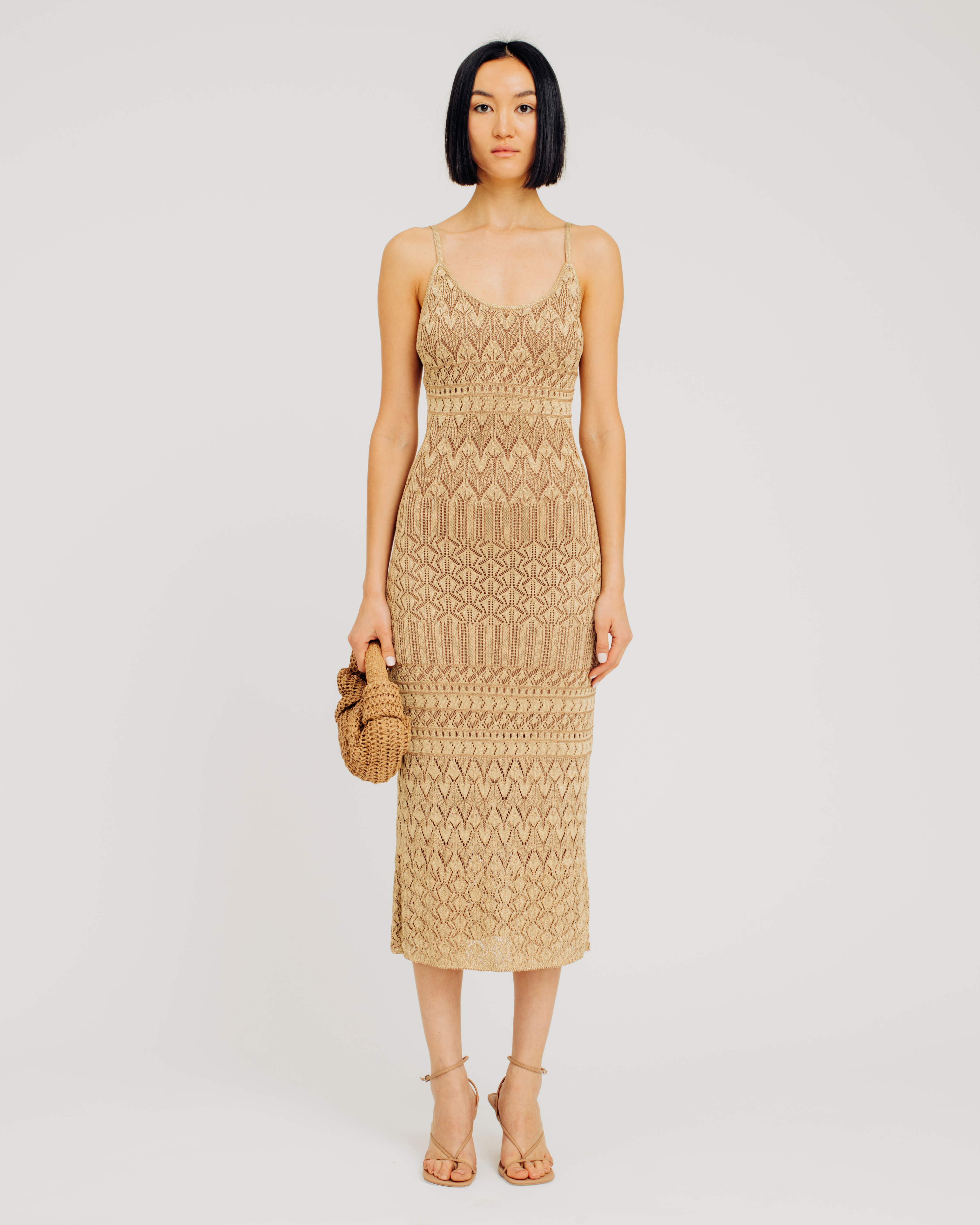 The Vanessa Dress is a midi-length stunner is crafted with a fully fashioned pointelle stitch and plaited knit that sculpts and moves with you. A subtle shimmer catches the light, while delicate shoulder straps and full lining ensure a flawless fit.