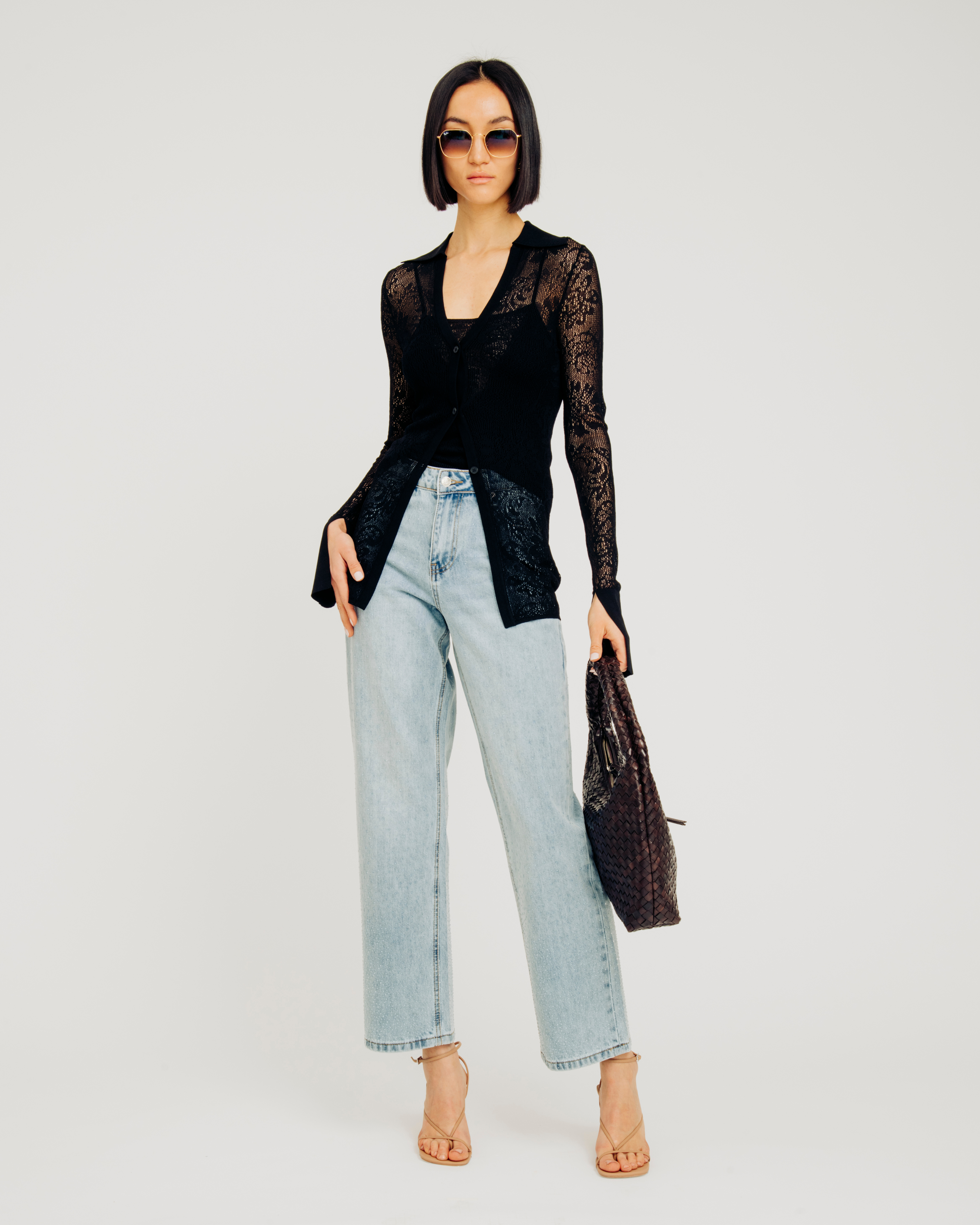 The Theia Top is a striking black cardigan that blends sharp structure with a touch of edge. Designed to be worn open or closed, it pairs seamlessly with the Theia Camisole for a refined yet daring look. Whether thrown over denim for a laid-back vibe or styled with sky-high heels for maximum impact, this piece is a statement.