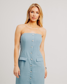 The ELLIE DRESS is a statement in minimalist style and contemporary sophistication. This strapless midi dress stands out with its raw-edged neckline and elegant front button placket, delivering a modern and feminine touch. Finished in a refined slate blue hue, it’s a timeless essential for elevated day-to-night dressing.