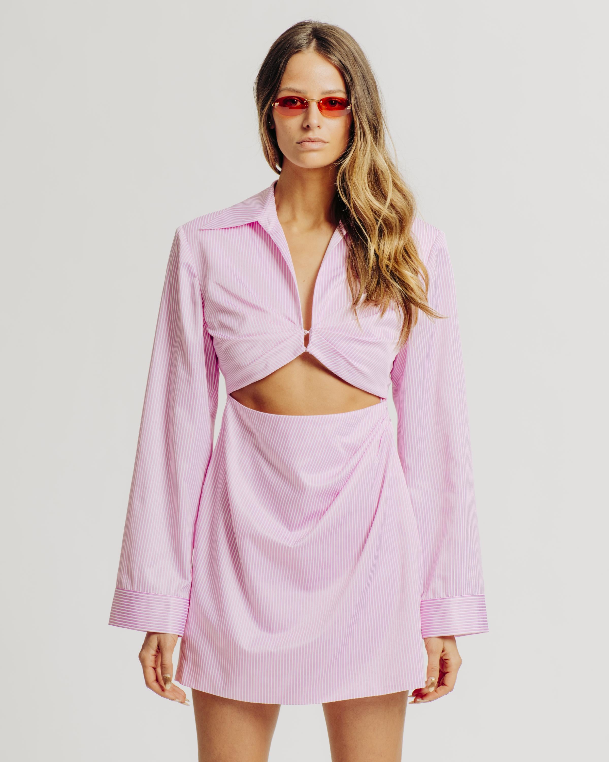 The Char Dress a sassy and playful addition to your spring wardrobe. This collared mini dress is anything but ordinary, featuring a daring front cutout and eye-catching striped detail that exudes modern charm. Crafted to ignite your playful side, the Char Dress is designed to make a statement wherever you go. Whether you're brunching with friends or hitting the dance floor, its sexy silhouette promises to turn heads and spark conversations. Elevate your style with Torn by Ronny Kobo this Spring.