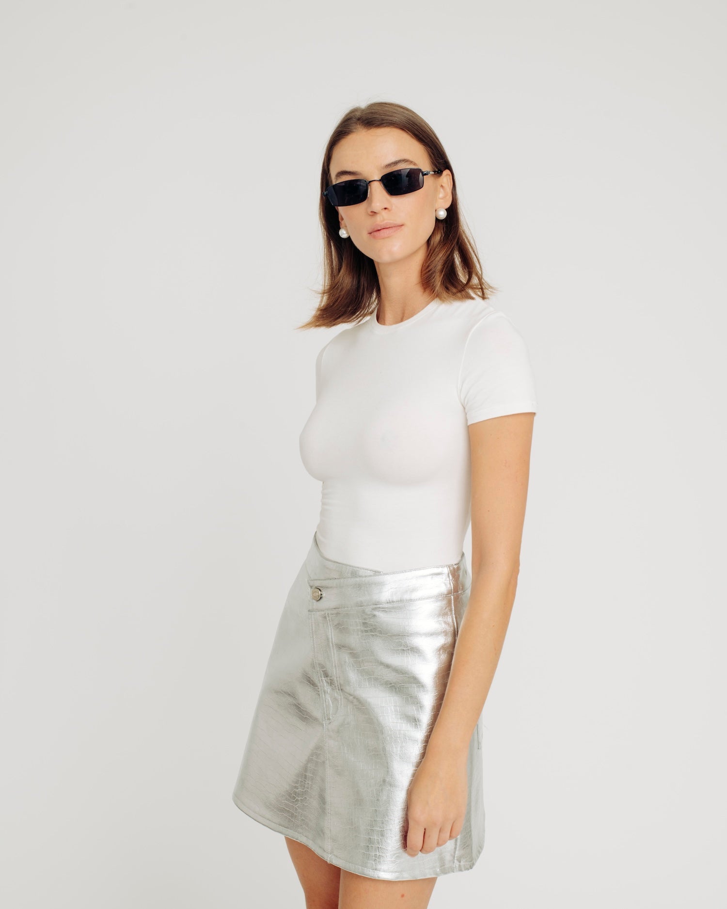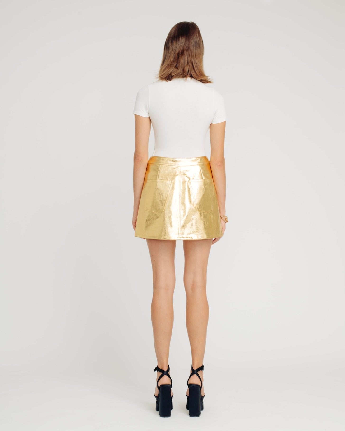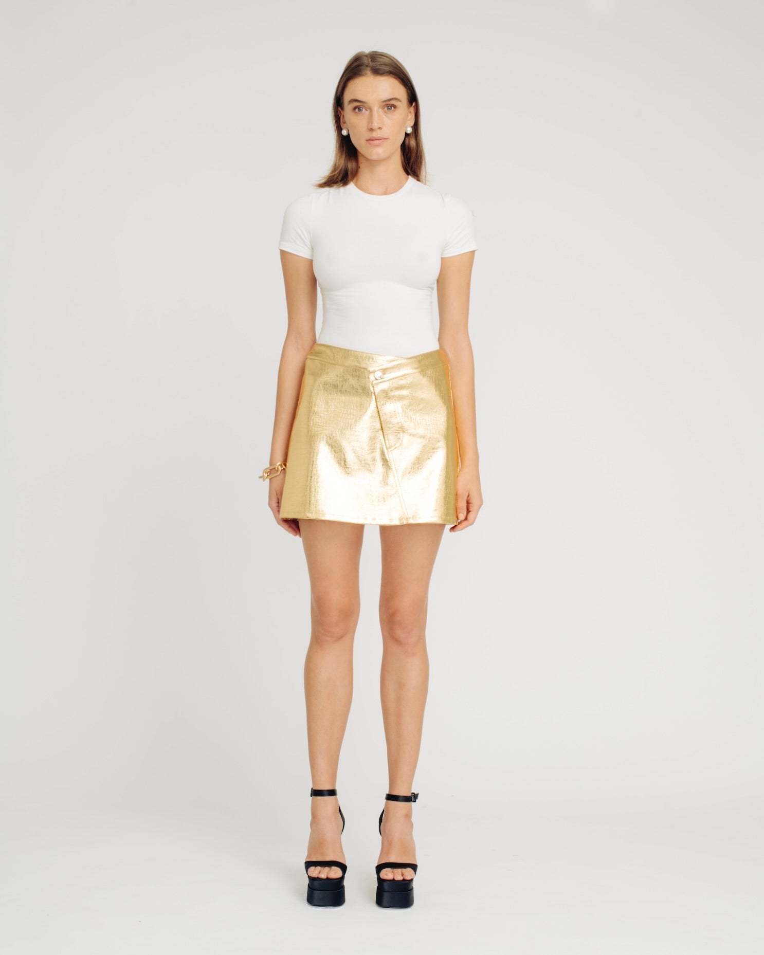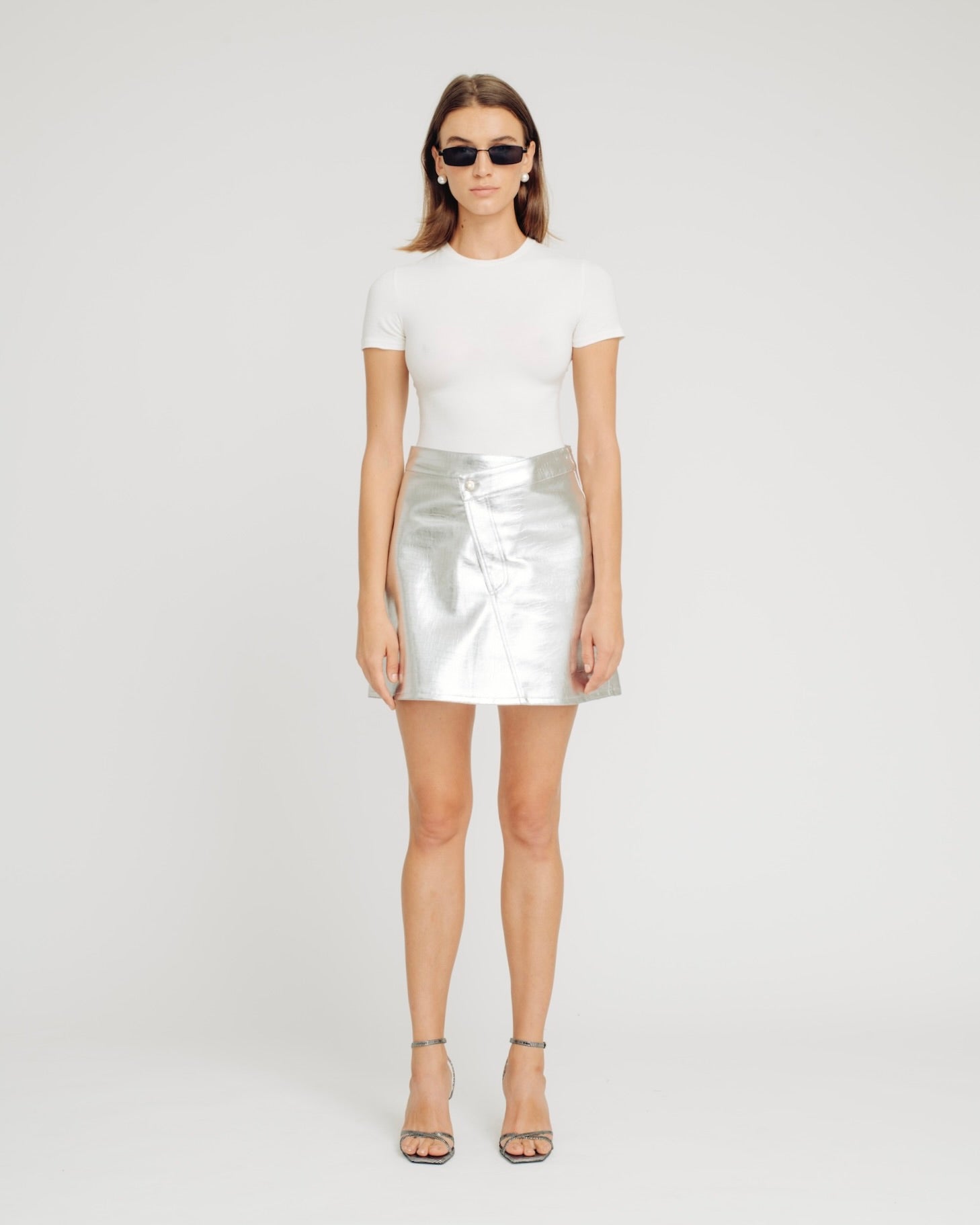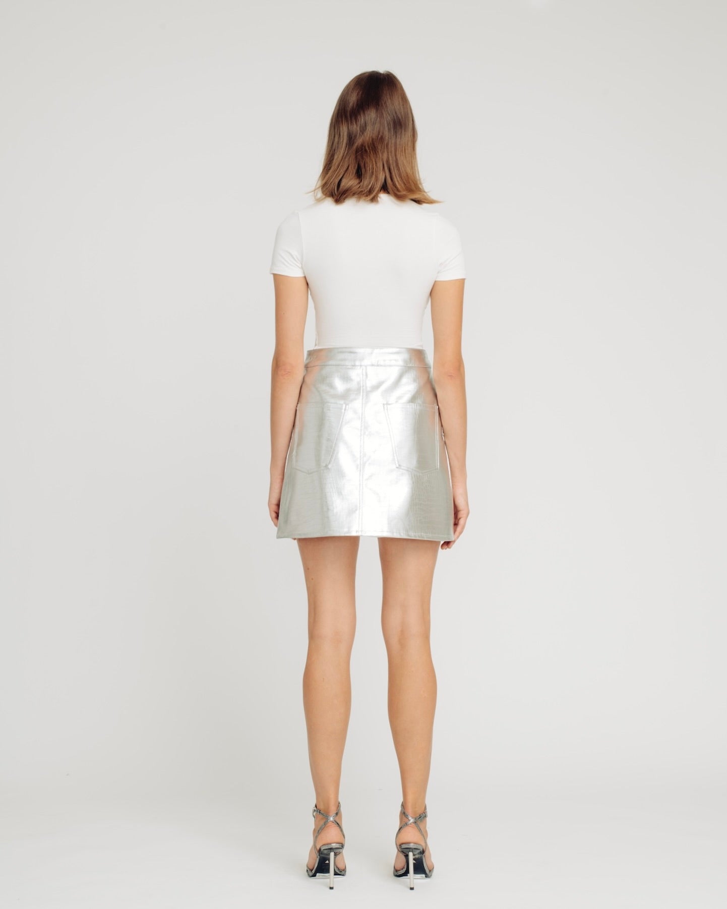 Donnie Skirt, a provocatively bold Asymmetric Faux Leather Metallic masterpiece that unleashes an alluring blend of contemporary edge and irresistible glamour. This skirt is a celebration of dynamic style, where the faux leather and metallic allure come together for a seductive ensemble. Perfect for those who crave an unconventional fusion of sophistication and daring sexiness, the Donnie Skirt epitomizes the distinctive Torn by Ronny Kobo aesthetic. Elevate your wardrobe with this standout piece, where every curve and metallic sheen tell a story of confident allure, leaving an indelible mark on your personal style with a touch of undeniable sexiness.