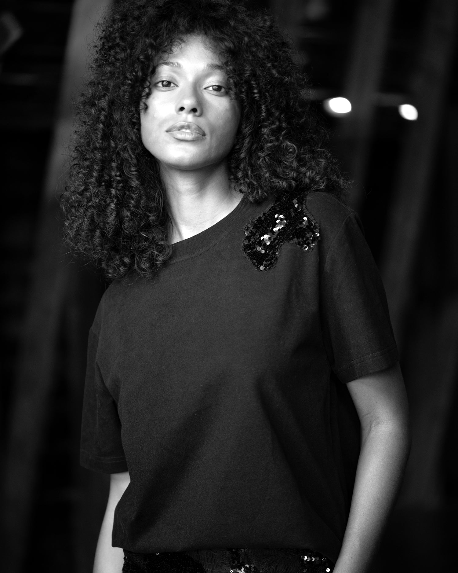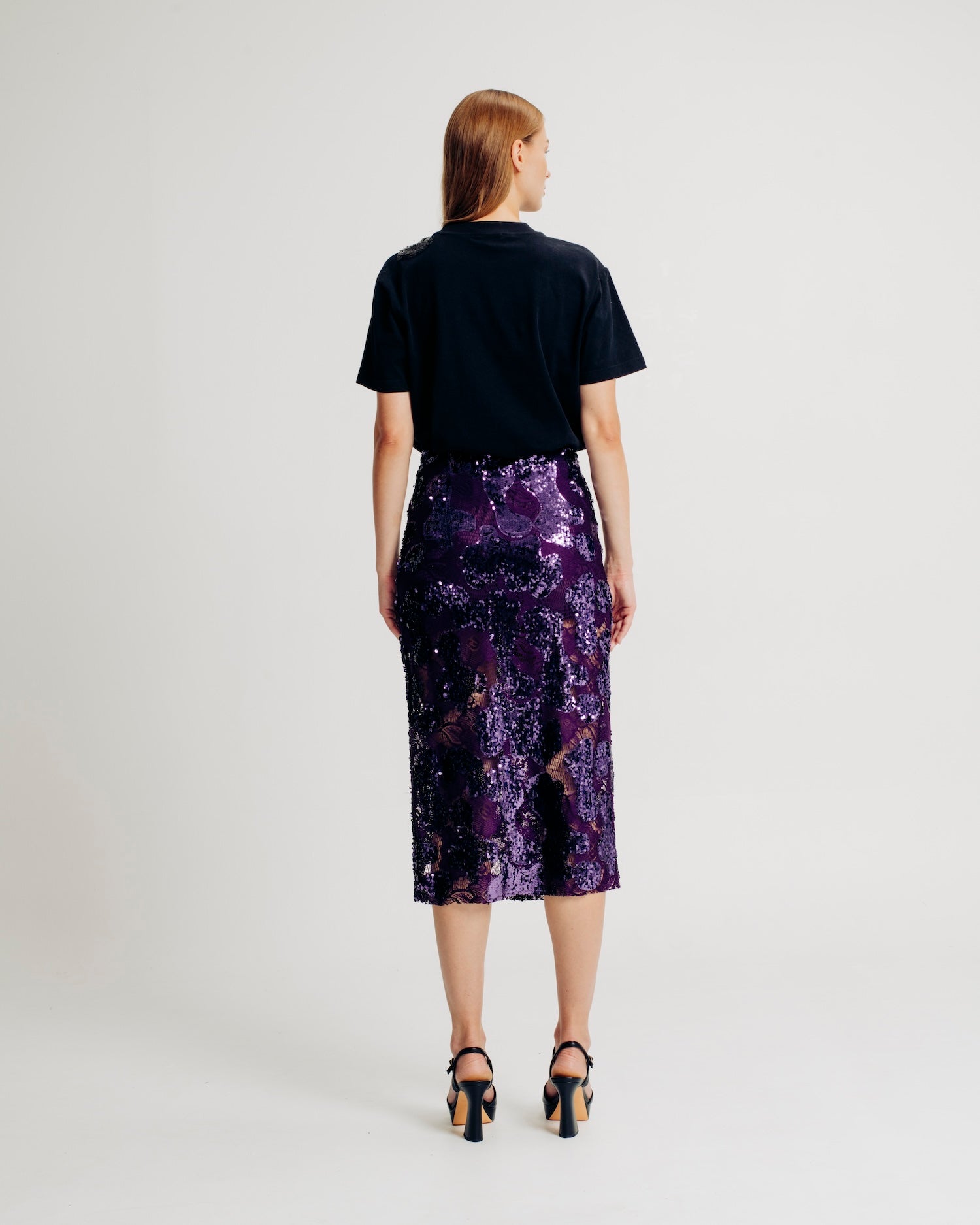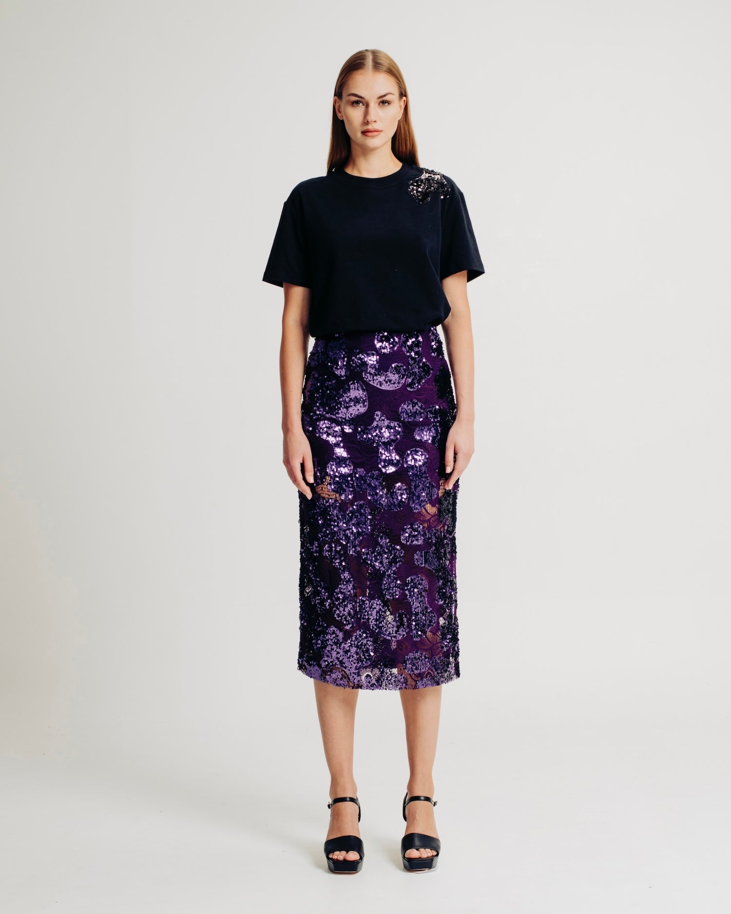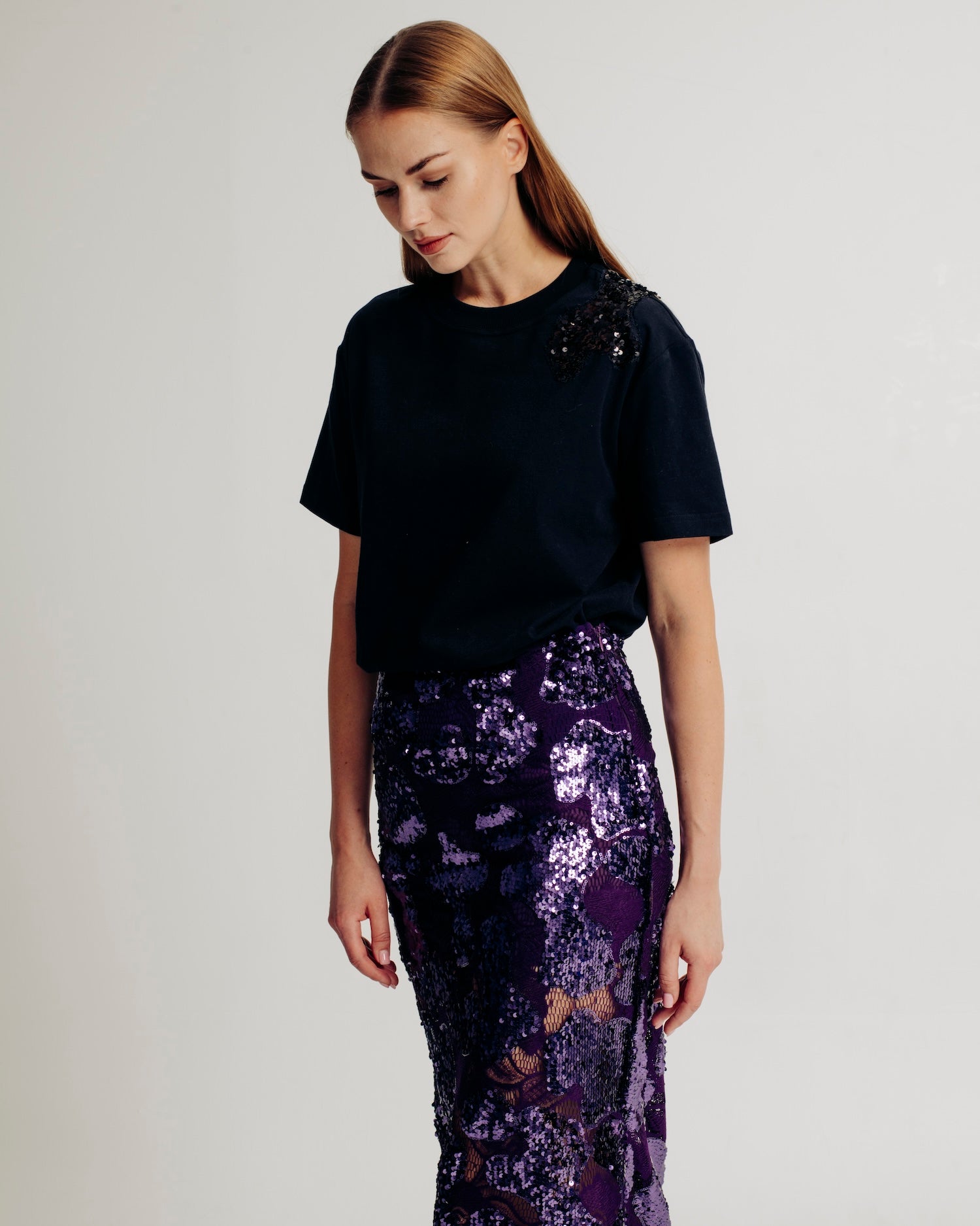 The Ava Top is a mid-weight jersey tee adorned with exquisite sequin appliqué at the left shoulder, adding a touch of sparkle and sophistication. This embellishment is carefully designed to match and complement the Ava Skirt, creating a harmonized and stylish ensemble.