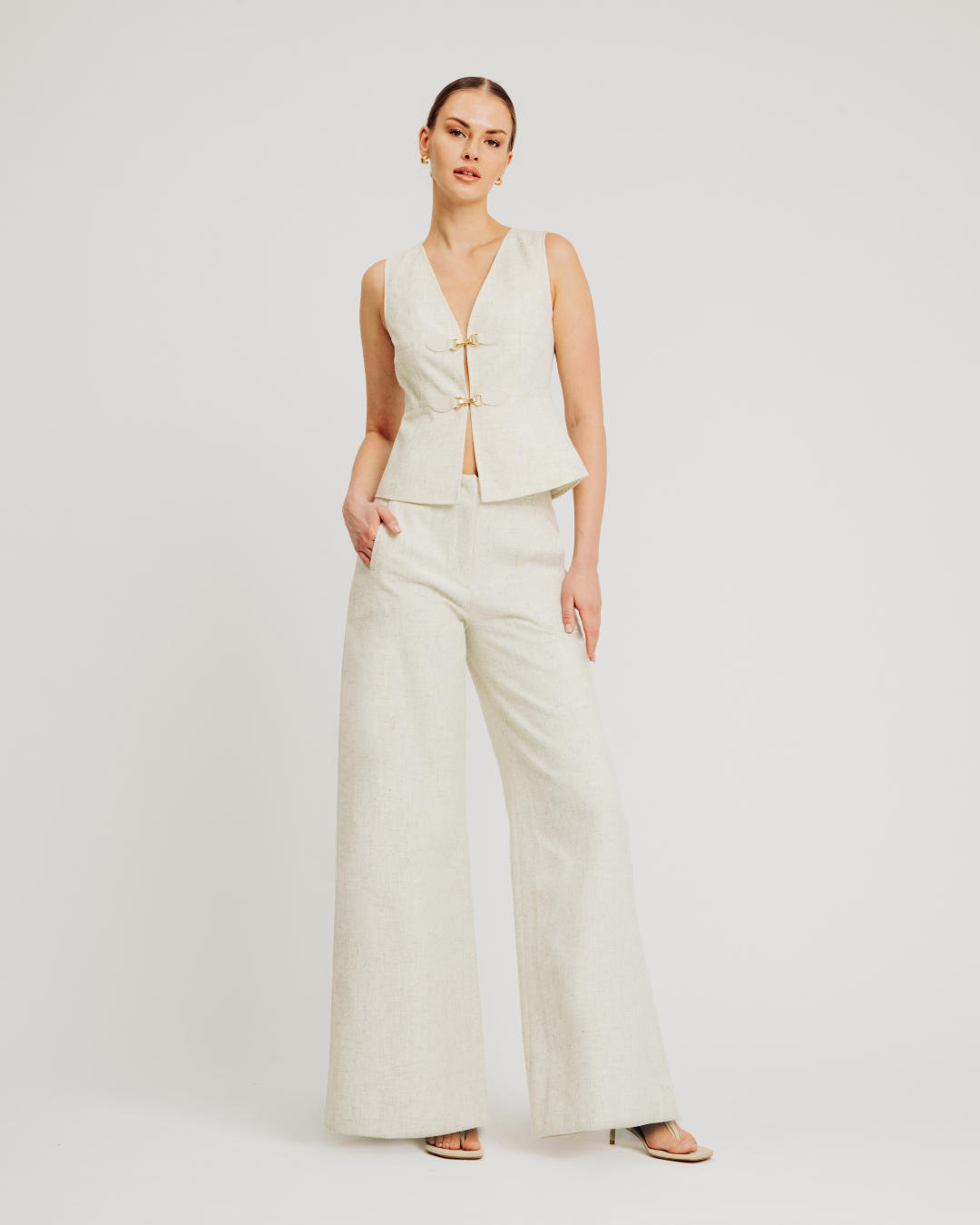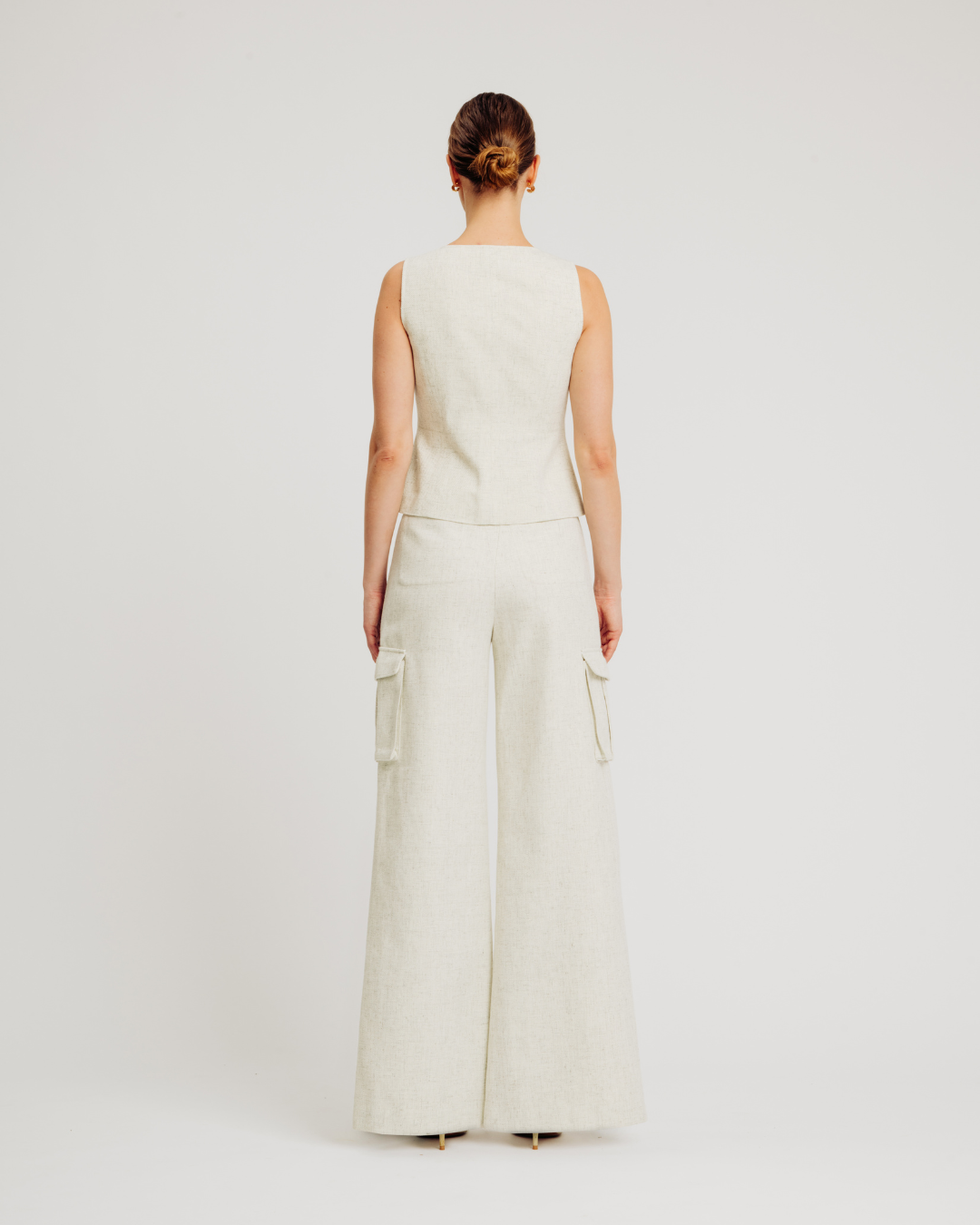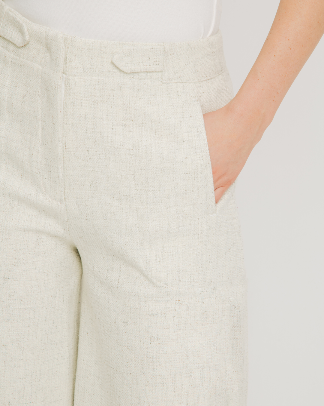 The Bernard Pant features a modern wide leg silhouette crafted from linen blend twill fabric for breathable comfort and structure. Designed with topstitching details, a front zip fly closure, tab detail at the waistband, and a center back gusset with horizontal belt loop for added functionality. Finished with back welt pockets, these trousers offer a polished yet relaxed look perfect for effortless everyday styling.