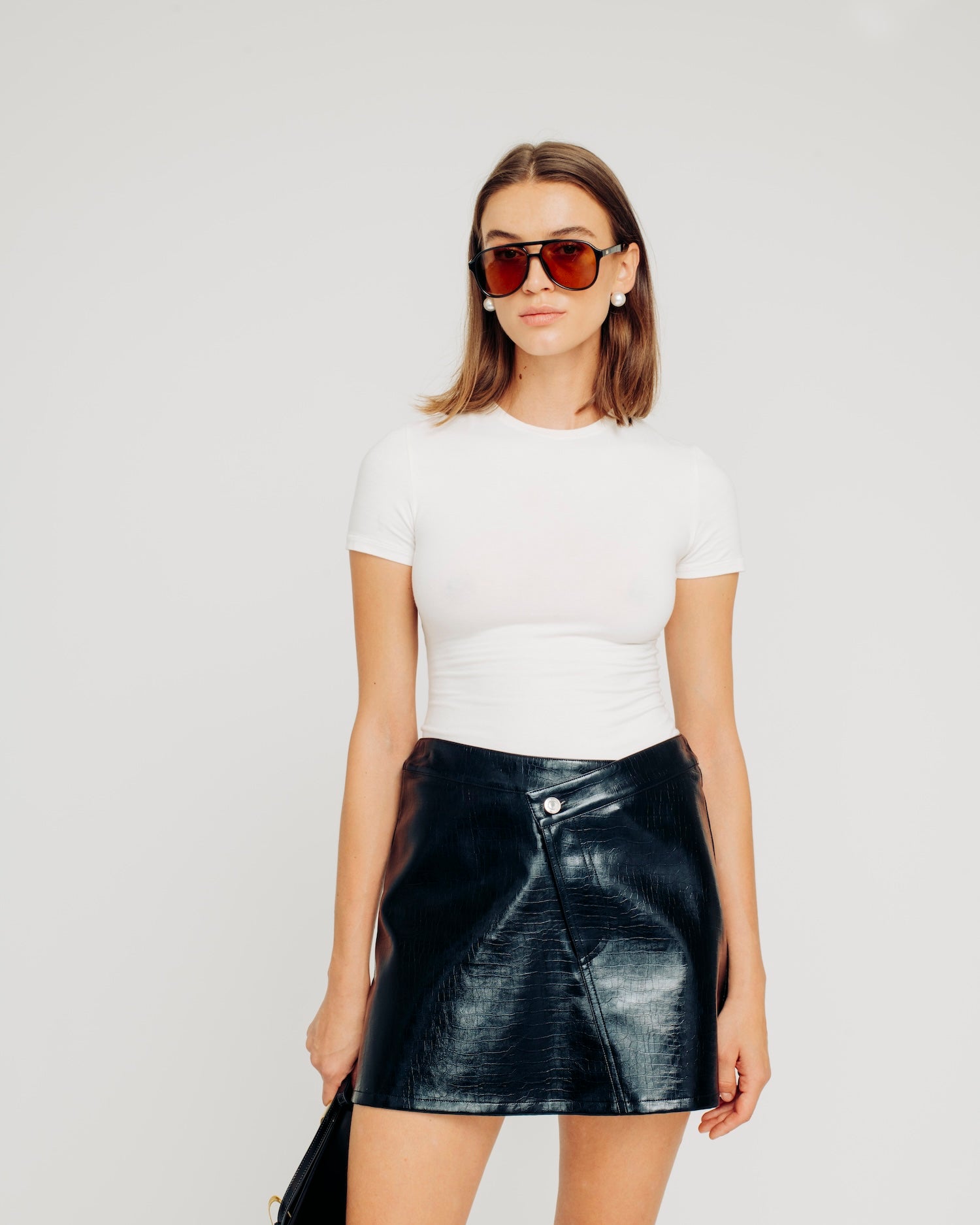 Donnie Skirt, a provocatively bold Asymmetric Faux Leather Metallic masterpiece that unleashes an alluring blend of contemporary edge and irresistible glamour. This skirt is a celebration of dynamic style, where the faux leather and metallic allure come together for a seductive ensemble. Perfect for those who crave an unconventional fusion of sophistication and daring sexiness, the Donnie Skirt epitomizes the distinctive Torn by Ronny Kobo aesthetic. Elevate your wardrobe with this standout piece, where every curve and metallic sheen tell a story of confident allure, leaving an indelible mark on your personal style with a touch of undeniable sexiness.