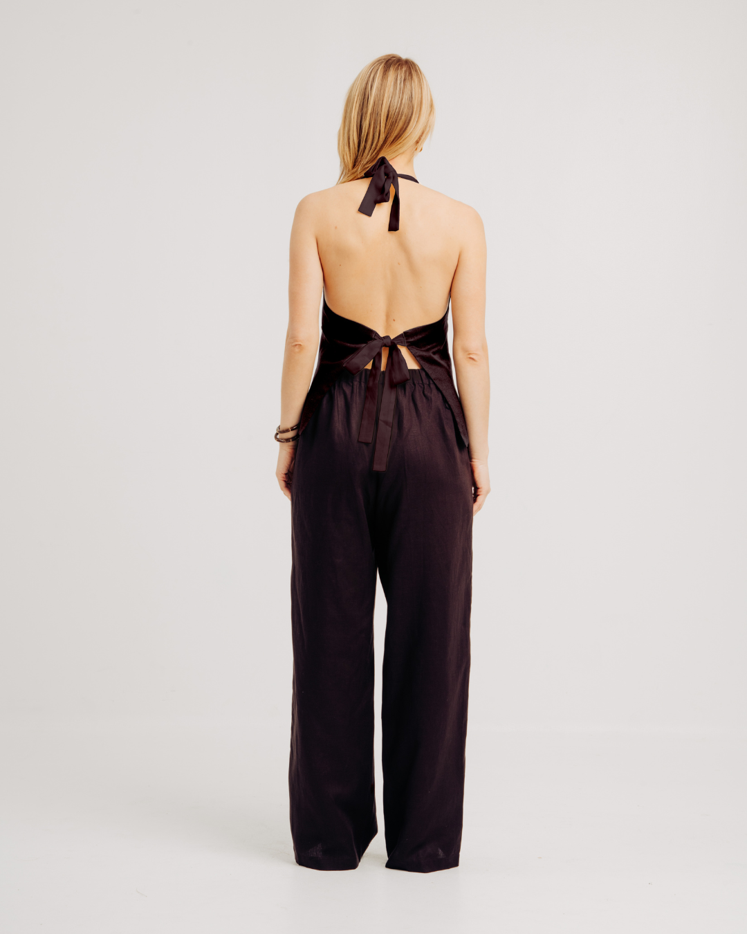 The ALINA VEST redefines classic tailoring with a sleek halter silhouette and modern details. Contrast ties at the neck and back offer an adjustable fit, while structured seams and polished accents keep the look refined and versatile—perfect worn solo or layered.