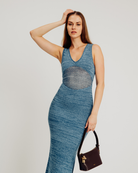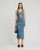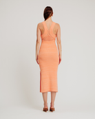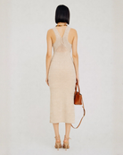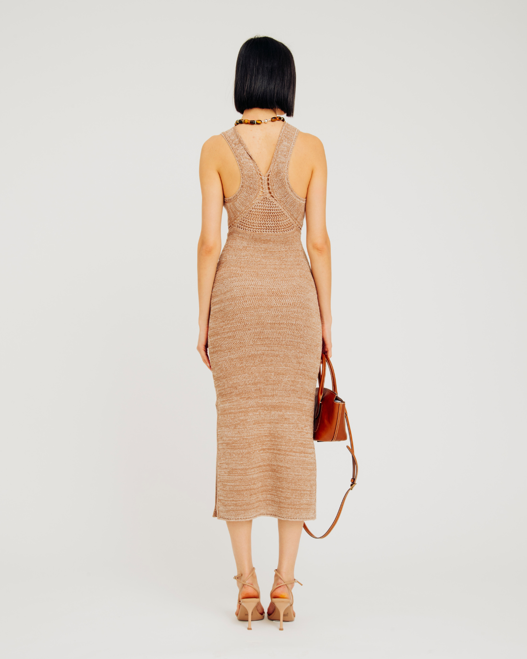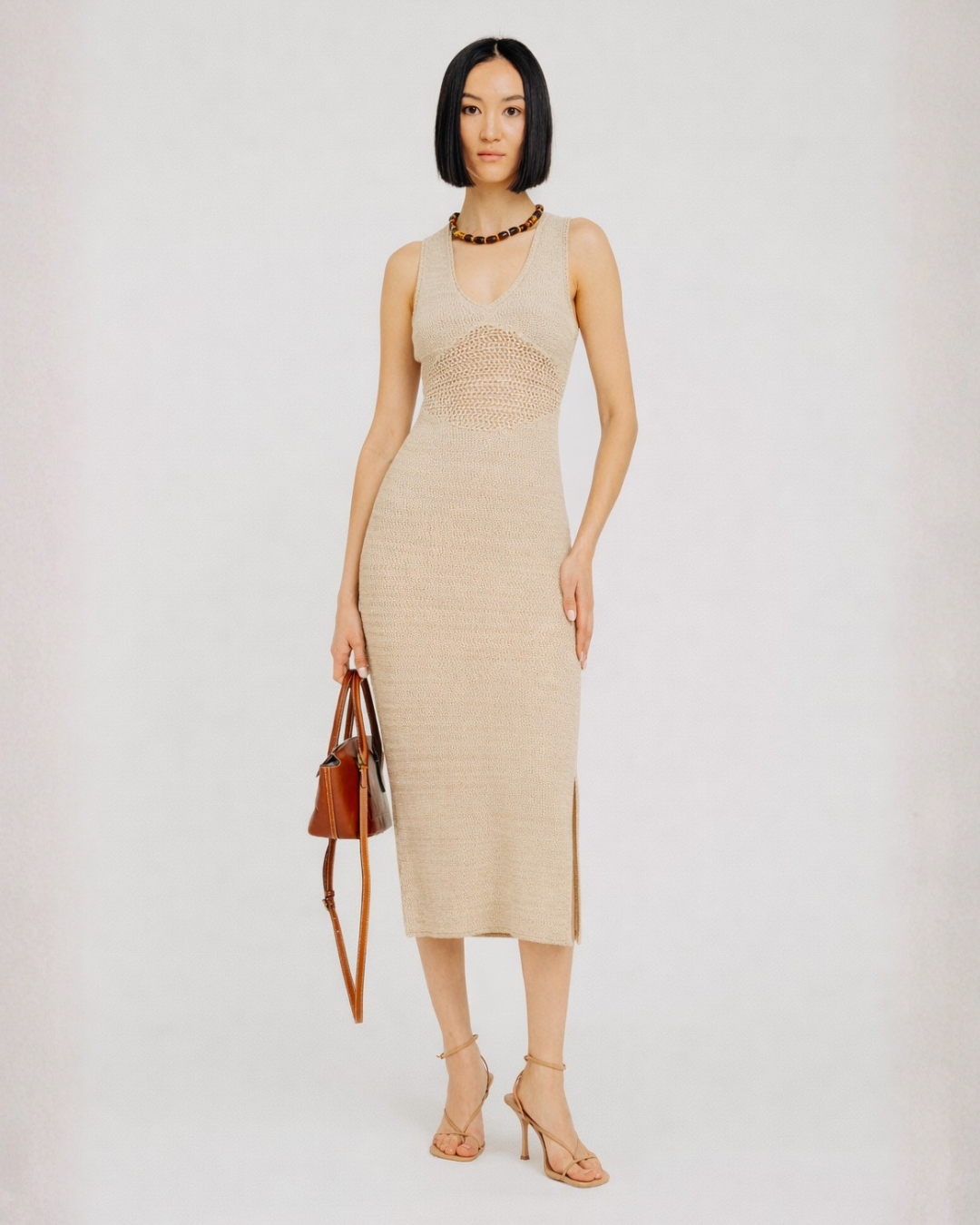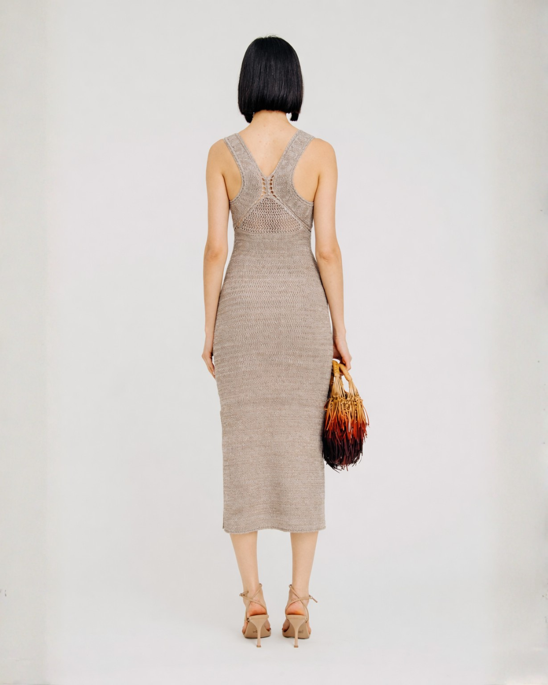 The Melanie Dress—a body-hugging knit that features a fully fashioned knit with a crochet stitch that clings in all the right places. The deep V-neckline teases just enough, while a racerback adds a sporty edge. A side slit brings movement, while contrast stitch detailing at the waist cinches the silhouette.