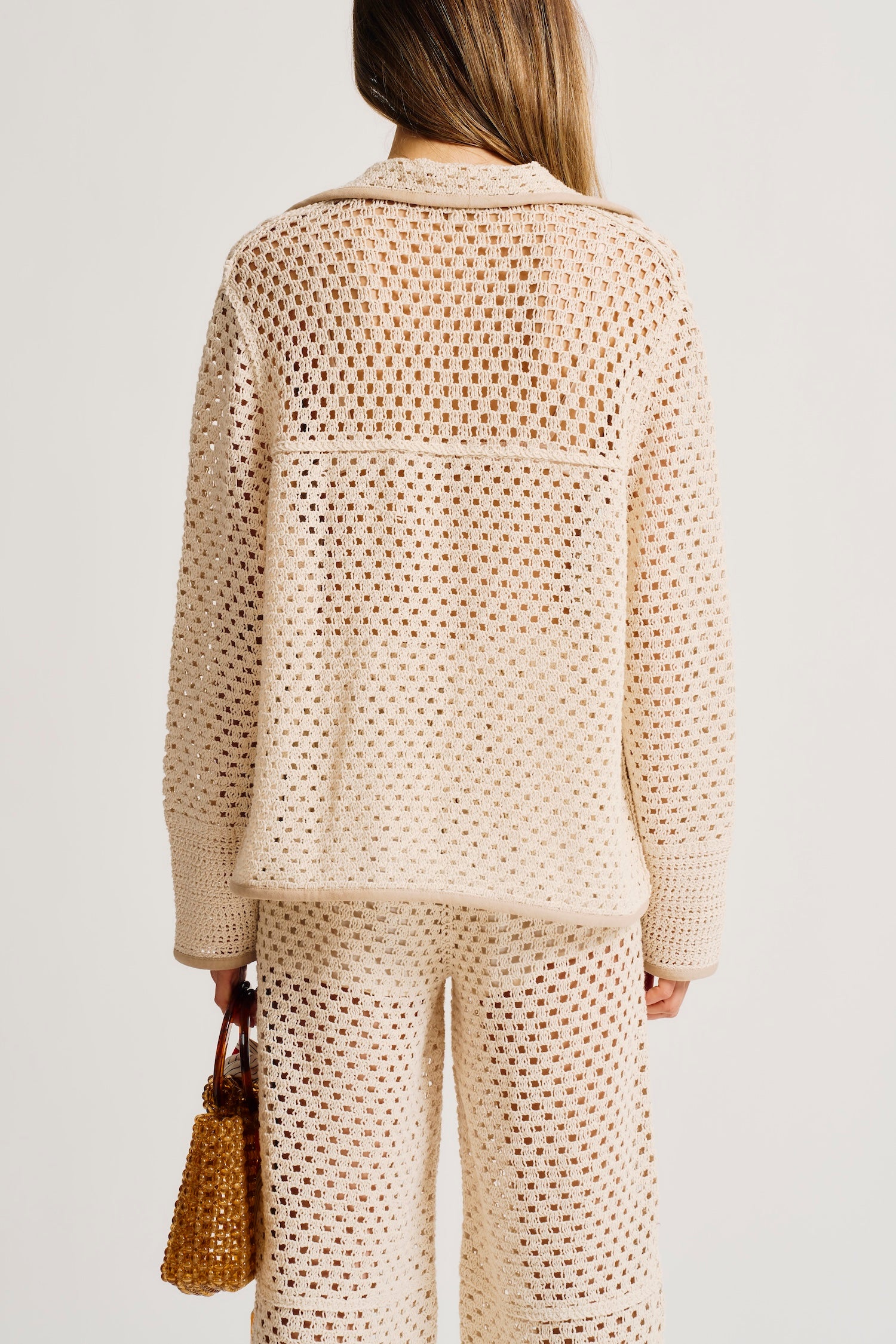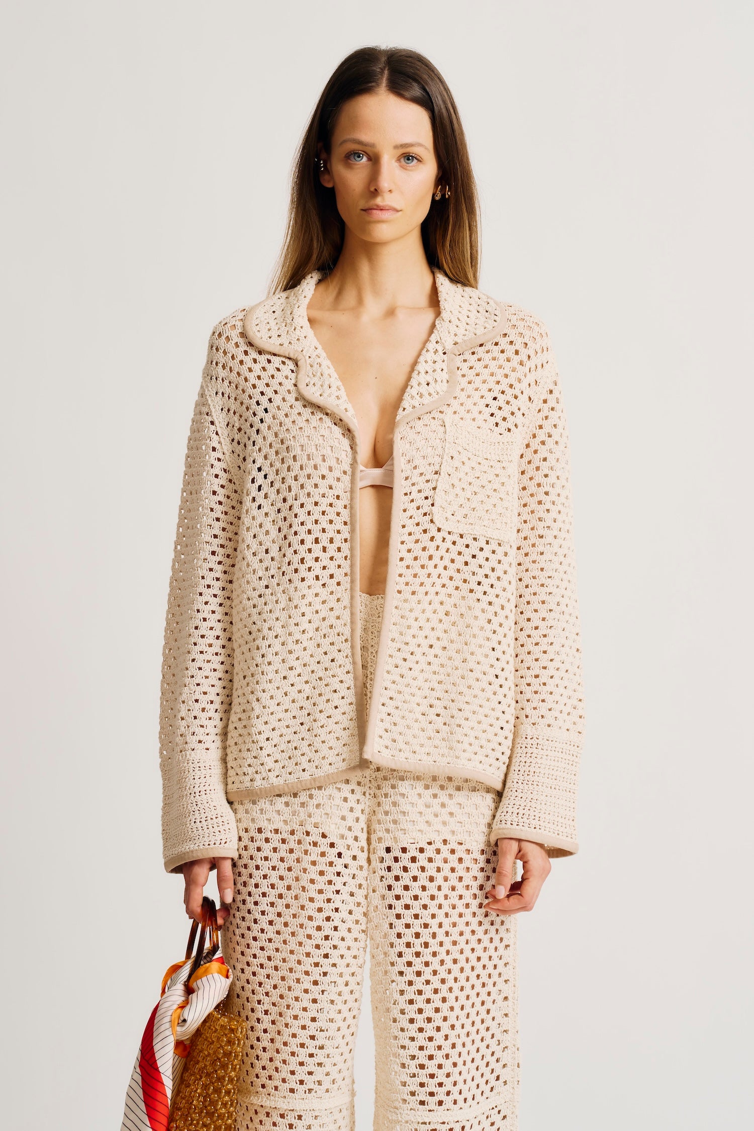 The NICOLE TOP redefines casual elegance with its boxy silhouette and open front design. Crafted with an allover crochet stitch, it offers a breathable and textured feel. The rounded collar and lapel, along with faux suede trim detailing on the placket, cuffs, and collar, add a touch of sophistication. A seam detail at the back enhances its structured look, making it a versatile piece for layering or standalone wear.